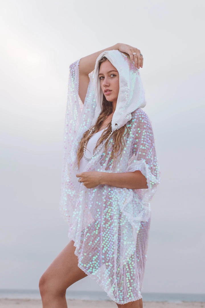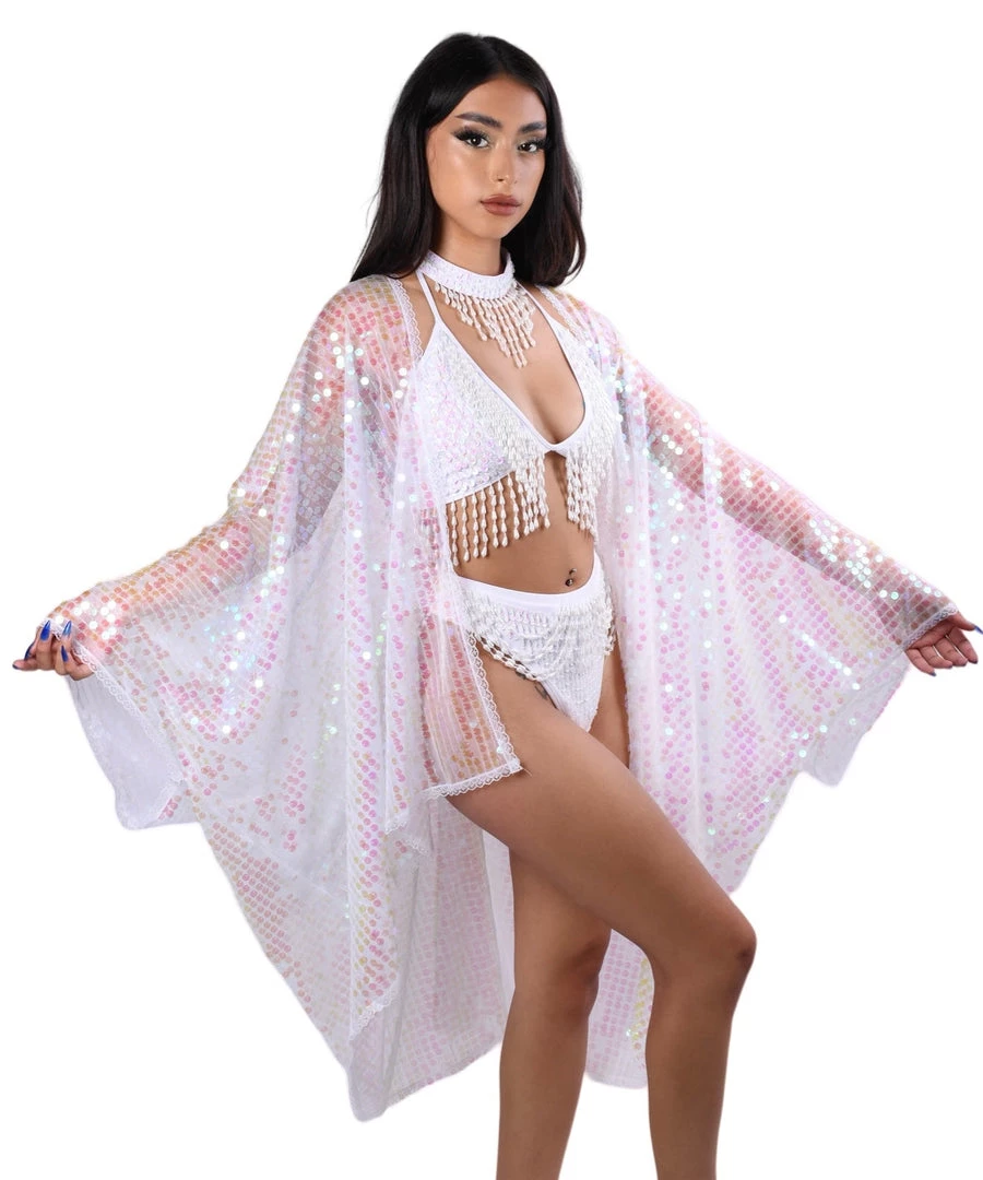 Dance the night away in this iridescent fairy look. This outfit comes with our techno doll hand stitched set and pink iridescent kimono. Each individual sequin reflects the light to shine in every direction. We want you to be the center of attention- that why we ensure the sequins and fabric are of the highest premium material.