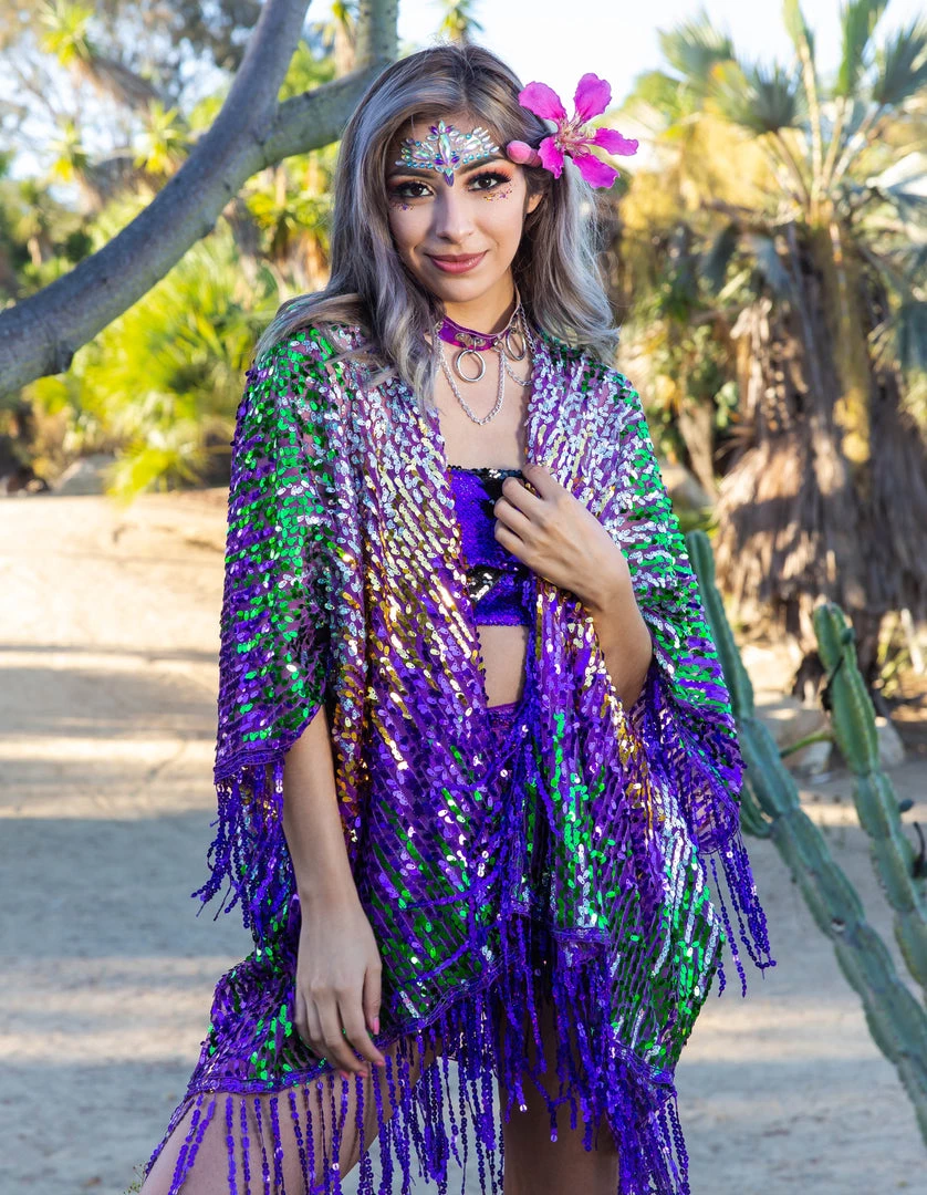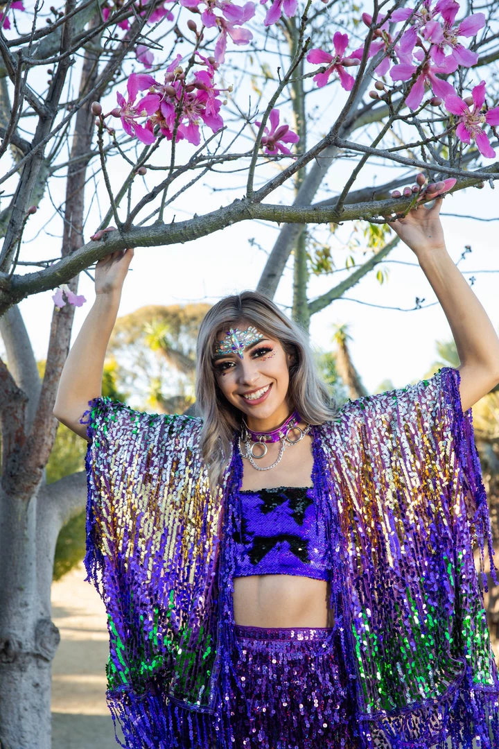 Our unique & beautiful holographic mermaid sequin kimono is exclusively designed and handmade in the USA. We use only the highest quality fabrics and sequins, spreading positive vibes through your movement. This amazing unisex kimono features massive sparkle & shine with sequins that reflect purple, green, gold and silver colors. In the sunlight, the sequins can be seen for miles, during the night, it diffracts light from every direction, no matter how far away.