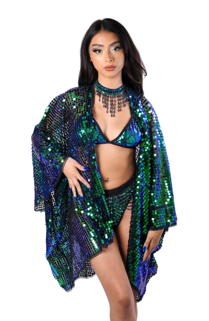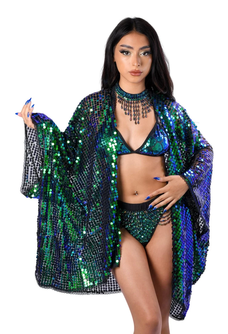 Dance the night away in this emerald green sequin kimono. Each individual sequin reflects the light to shine in every direction. We want you to be the center of attention- that why we ensure the sequins and fabric are of the highest premium material. Exclusively designed and handmade in the USA.Â