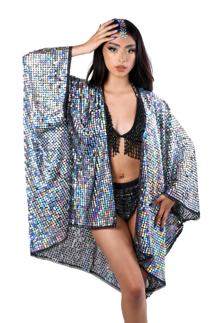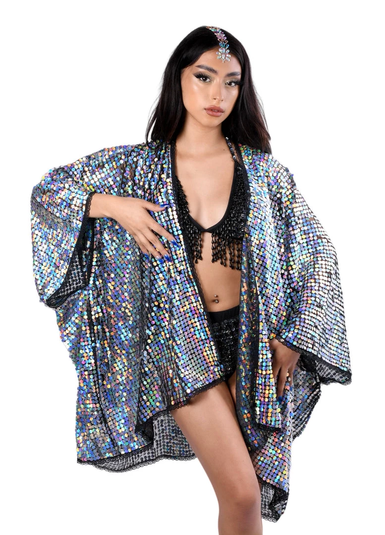 Dance the night away in this autumn holographic sequin kimono. Each individual sequin reflects the light to shine in every direction. We want you to be the center of attention- that why we ensure the sequins and fabric are of the highest premium material. Exclusively designed and handmade in the USA.