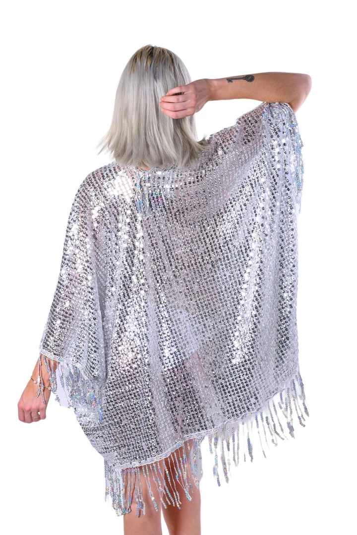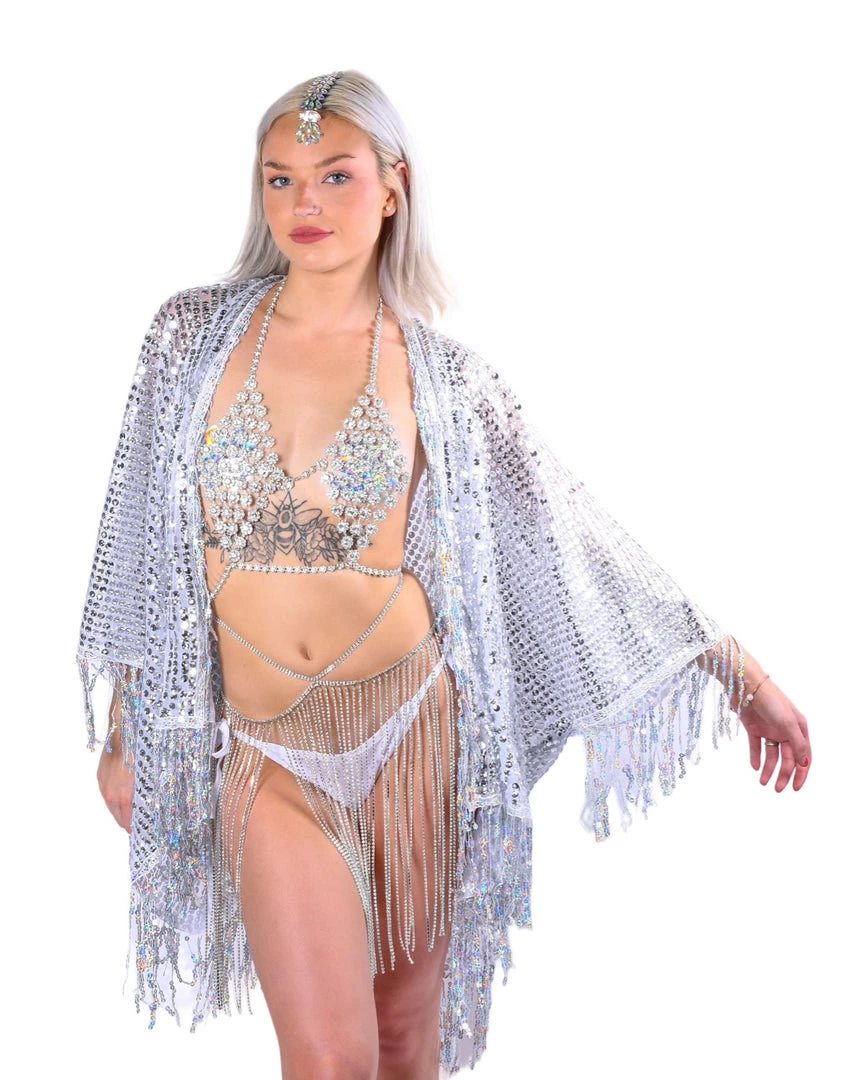 Dance the night away in this sparkly silver sequin kimono. Each individual sequin reflects the light to shine in every direction. We want you to be the center of attention- that why we ensure the sequins and fabric are of the highest premium material. Exclusively designed and handmade in the USA.