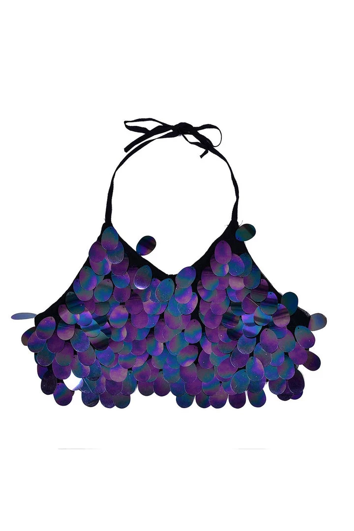 Our unique & beautiful aura unicorn sequin halter top is made of dark rainbow sequins that reflects amazing oil spill colors. The halter top is one size fits XS – XL. Tie at neck & back.