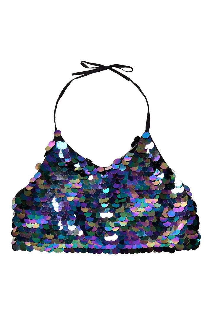 This aura unicorn sequin halter top is made of small round black rainbow sequins that reflects different colors like oil spill. The skirt is one size fits XS – XL. Tie at neck & back. Very comfortable, easy to style. Also good for a daily look.