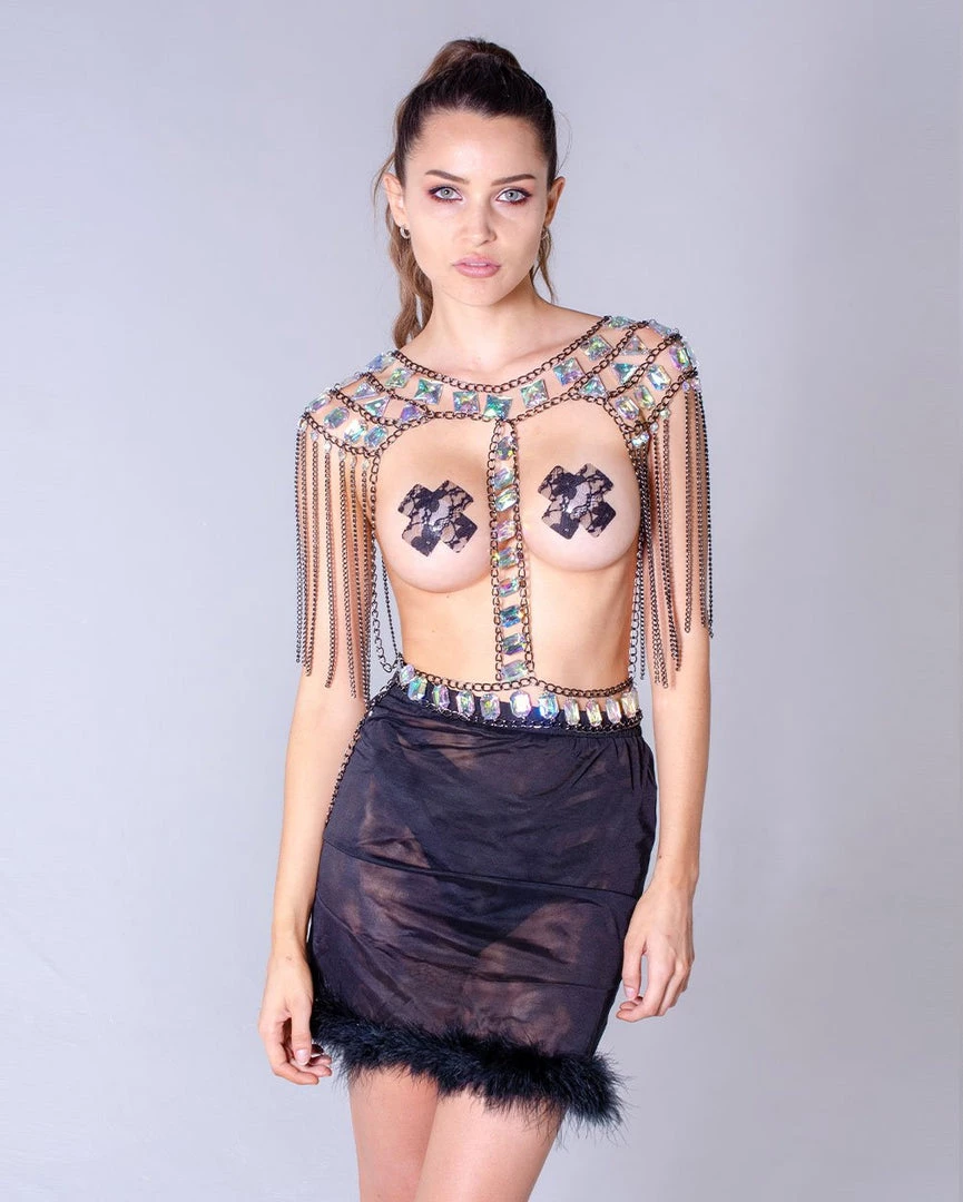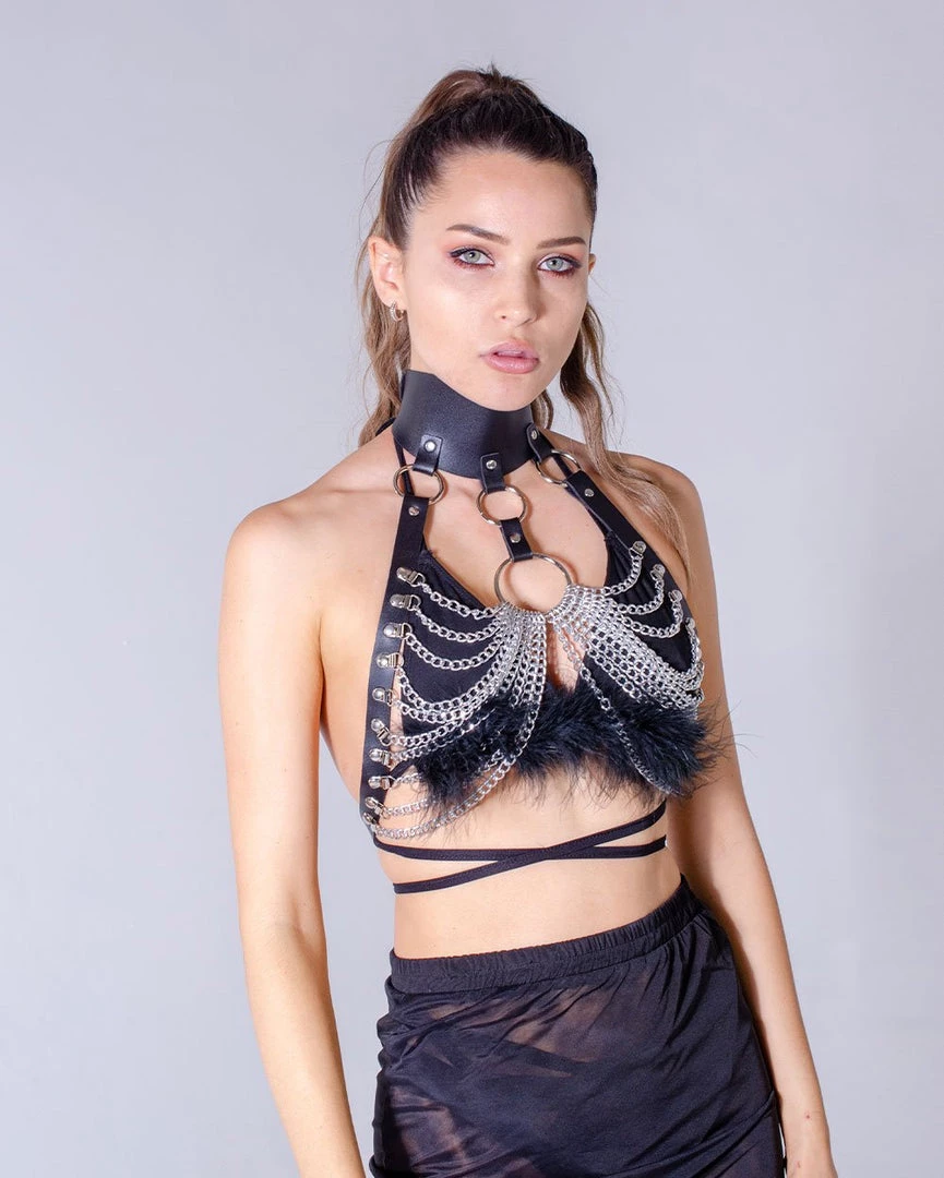 This black set contains a super cute fuzzy bra top and skirt that’s fuzzy on the edges, it is very soft and comfy to wear.