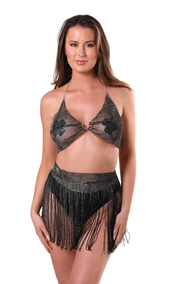 Sparkle all day and night long in this shiny black rhinestone set. This set includes a bra top with matching chain skirt.