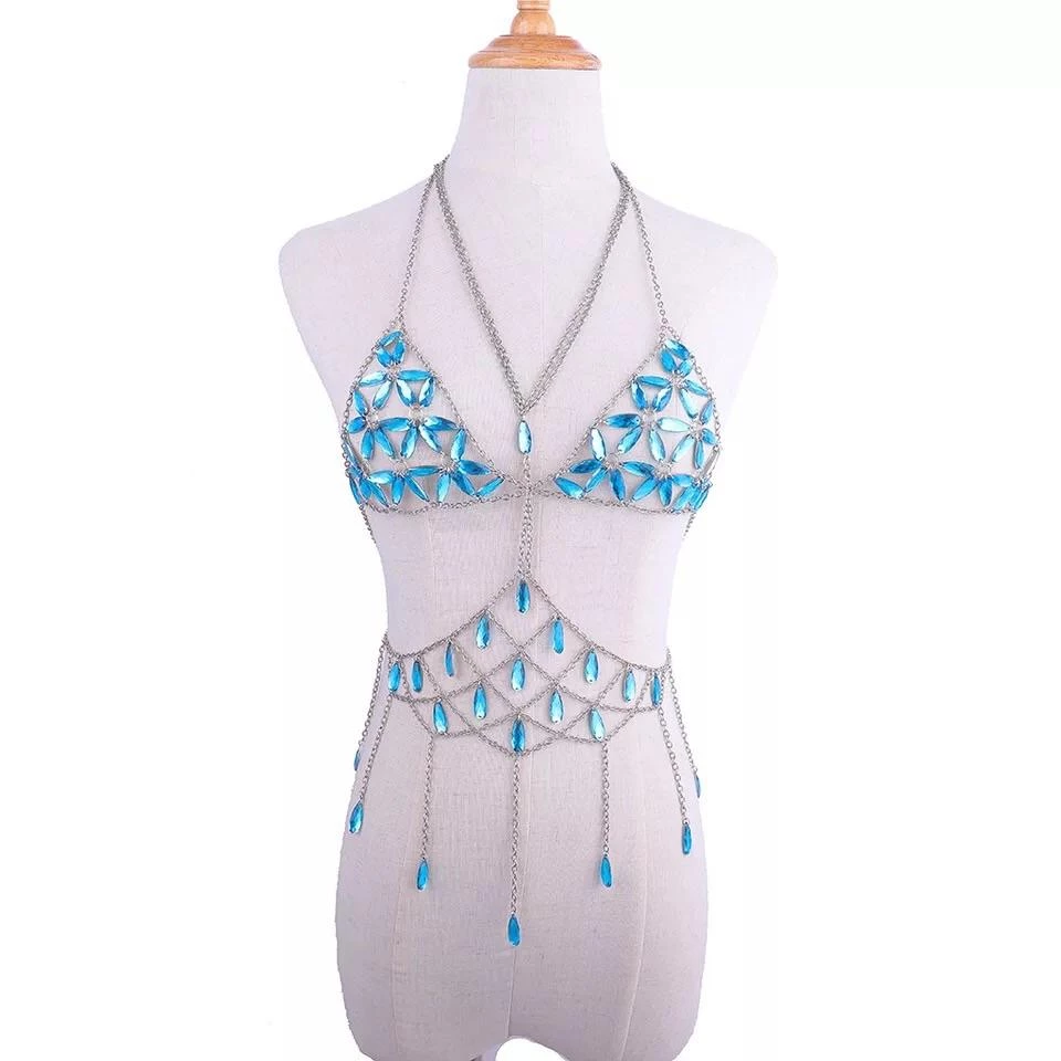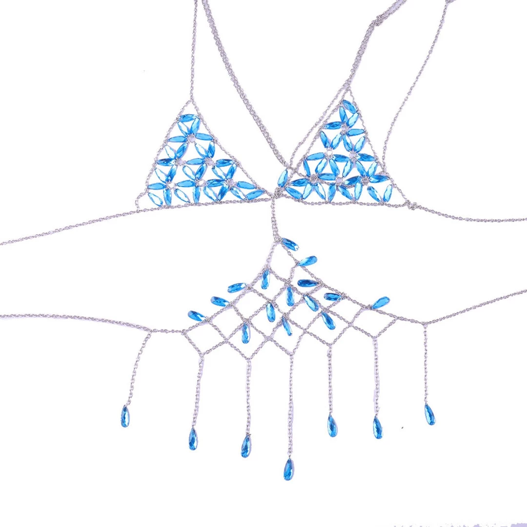 This blue daisy chain top is made of handmade blue flower shaped rhinestone pieces & silver chains, pair with a silver holographic bra top, a holographic bottom and our sequin kimono for a complete look and be prepare to get lots of compliments at festivals. Super easy to wear.