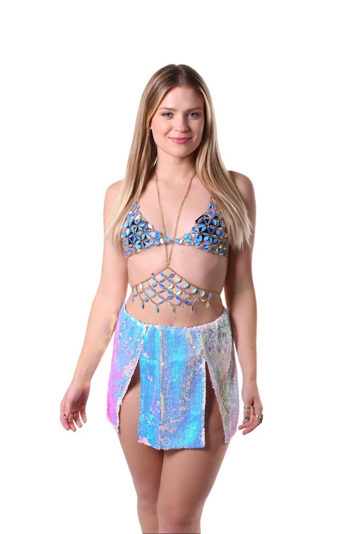 This aura iridescent blue chain top comes with two pieces and is made of handmade of sequins that shimmer under the light