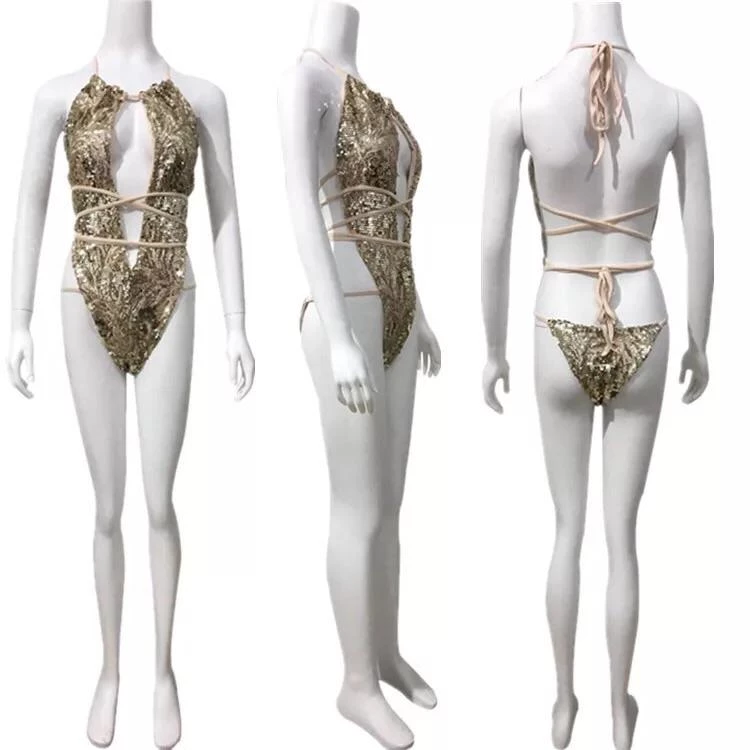 This special bikini bodysuit is made of sequins in champagne color. Great for summer/beach or any rave/festivals.