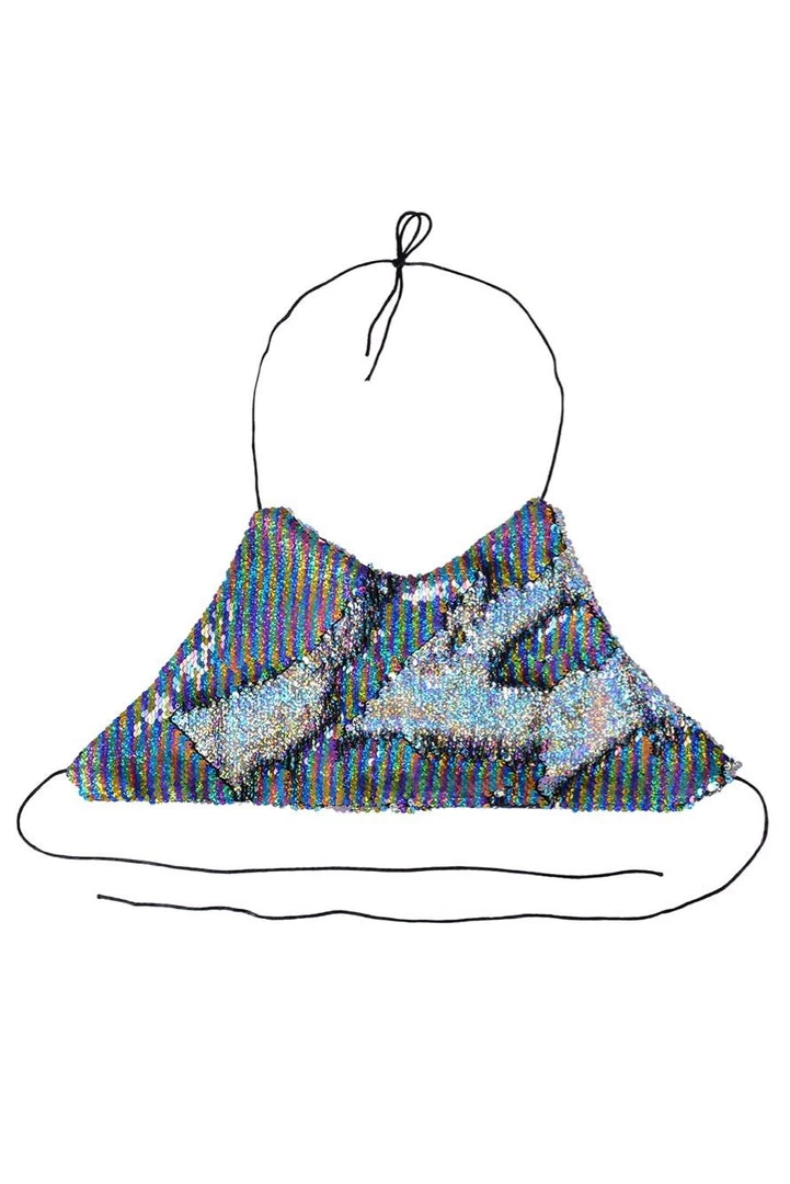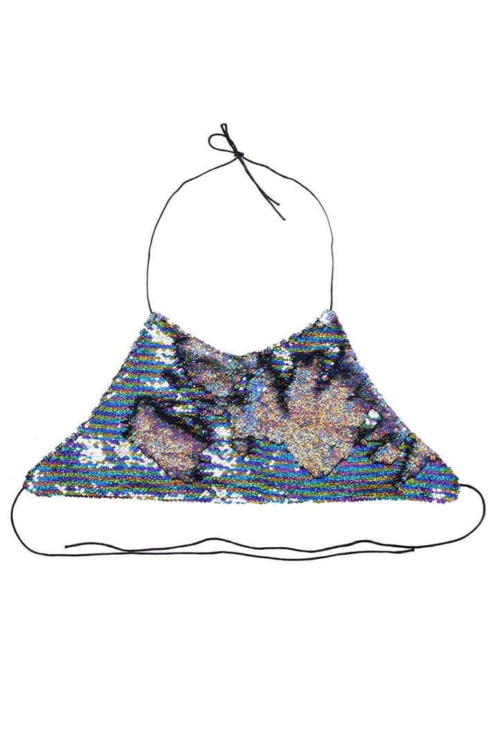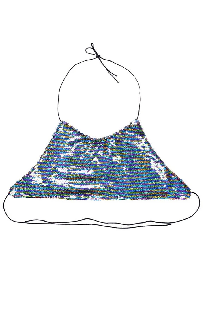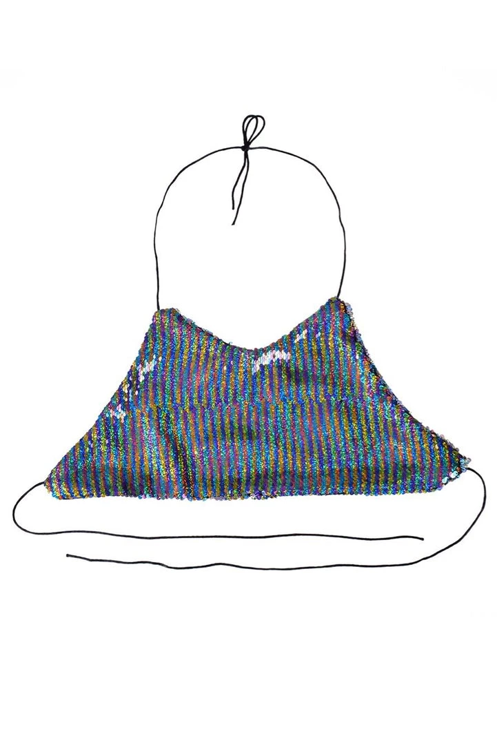 This unique reversible sequin halter top is made of reversible rainbow/holographic sequins. One of our most popular colors! The top is one size, tie at neck & back. Super adjustable & comfortable to wear.