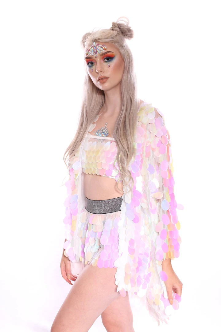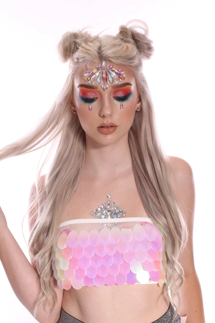 The cute Cotton Candy sequin tube top is made of pink/iridescent goddess sequins that reflects different colors from different angles. It is lace up in the back, you can also wear the backside as front to create a different look. Sequins are not just for Christmas but for every day!
