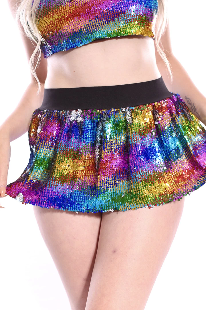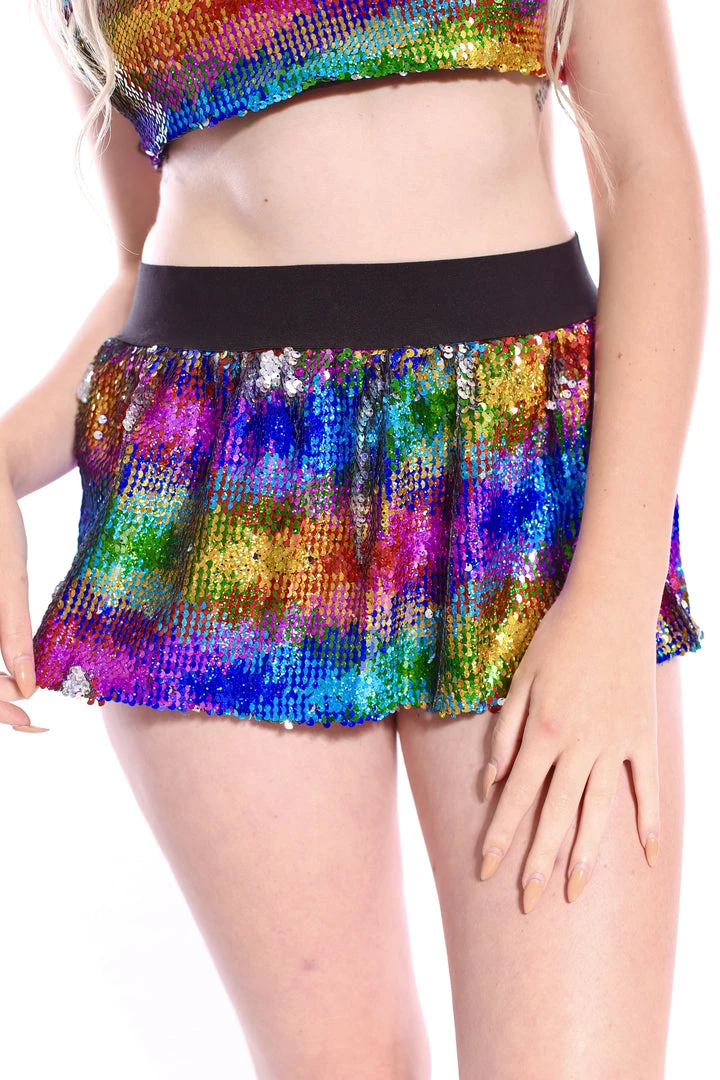 The reversible mini sequin skirt is made of rainbow holographic/silver holographic sequins. The skirt is one size fits XS – XL. The elastic is very stretchy that makes it super comfortable to wear.
