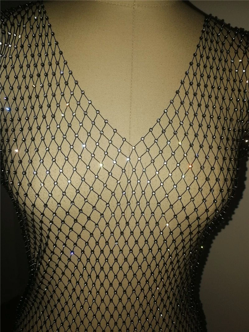 THE LUMi SHOP Dresses Rhinestone Black Fishnet Dress V- Body Jewelry