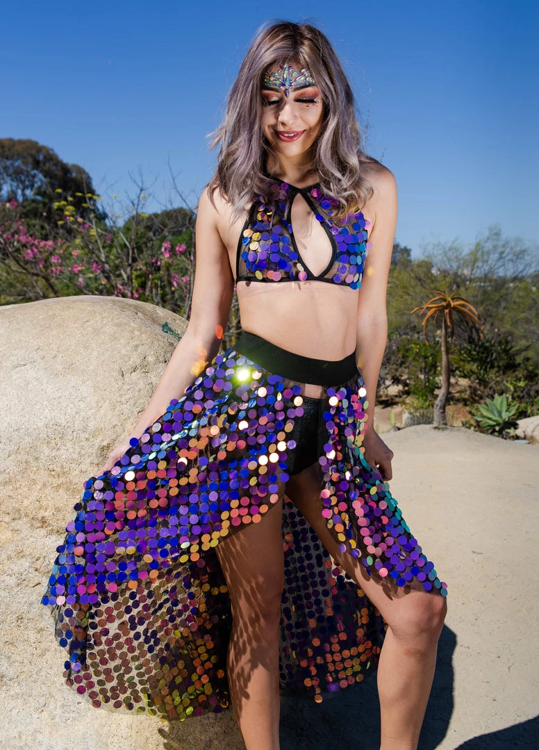 The electric lavender long sequin skirt is cute, sexy & super comfortable to wear. One size fits XS – XL with very stretchy elastic. Pair with any top to get glitz & glam! Great essential for not only festivals, but also everyday wear. Perfect for festival clothing, festival fashion, rave wear, & EDM outfits.