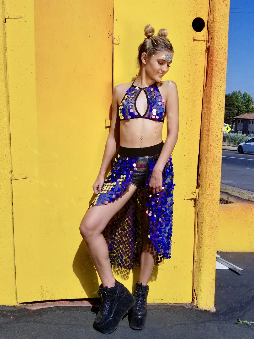 The sequins reflects different colors. Exclusively designed and handmade in the USA. We use only the highest quality fabrics and sequins, spreading positive vibes through your movement. In the sunlight, the sequins can be seen for miles, during the night, it diffracts light from every direction, no matter how far away.