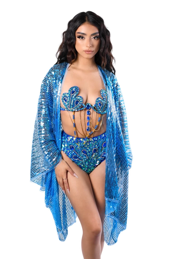 Queen of the ocean and tides this look is ethereal dream vibes. Featuring our blue peacock carnival top thats embellished with high quality gems and matching jewel bottoms. We’ve paired it with our waves sequin kimono for an all together fabulous look.