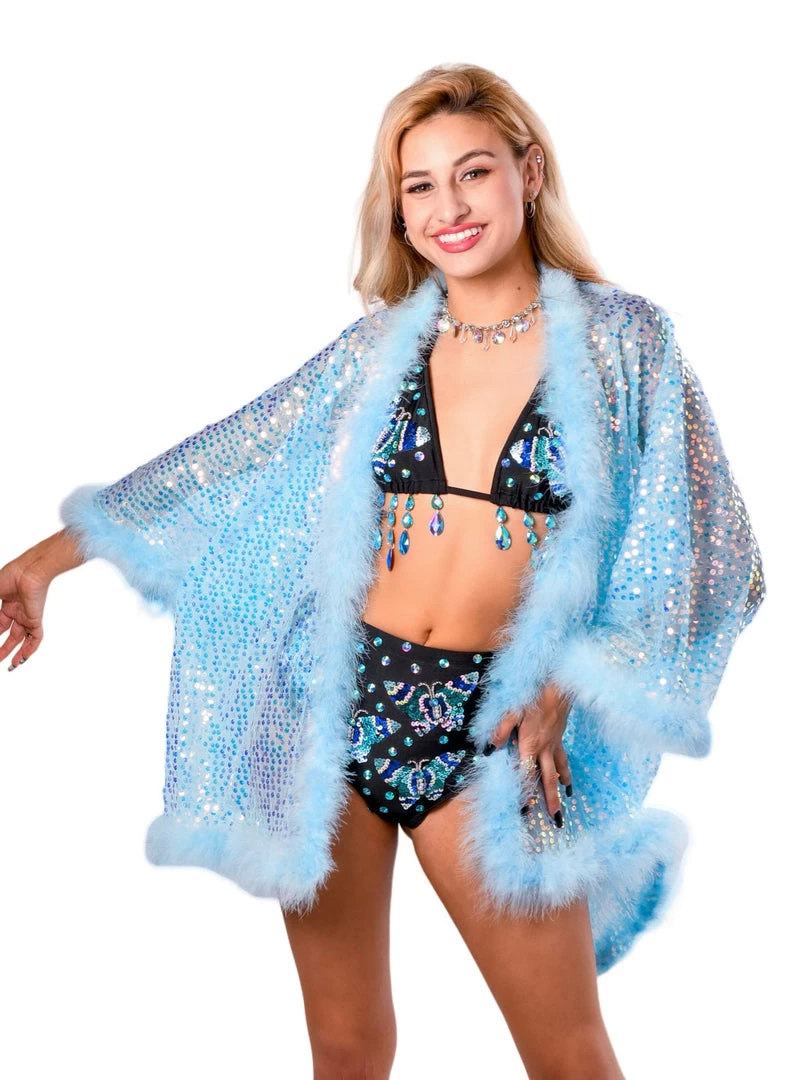 This iconic butterfly look contains our beloved hand stitched butterfly set and new baby blue fuzzy kimono made of the highest quality sequins and premium fabric.