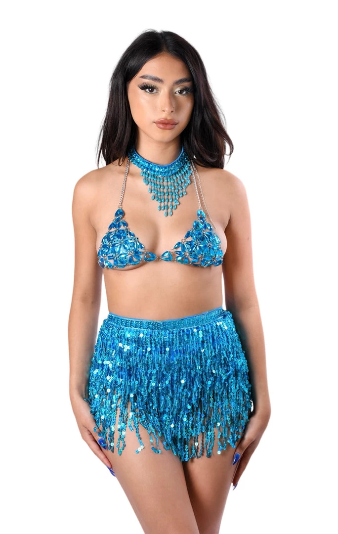 Step into your fantasy in this blue gem festival look. This fit includes a bright blue gem jewelry top, our aqua sequin tassel skirt and a matching blue necklace. Made of the highest quality materials and premium fabrics.