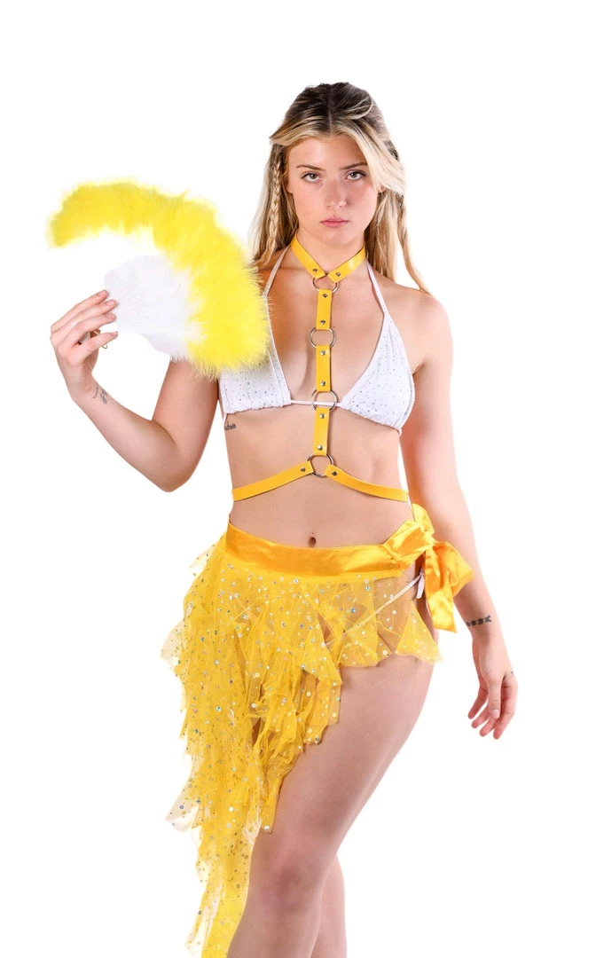 We love a babe in yellow. This bright yellow daisy look is here to bring the energy and light. This fit includes a white rhinestone bikini set paired with our lily lace sparkly long skirt and a matching yellow fuzzy fan.