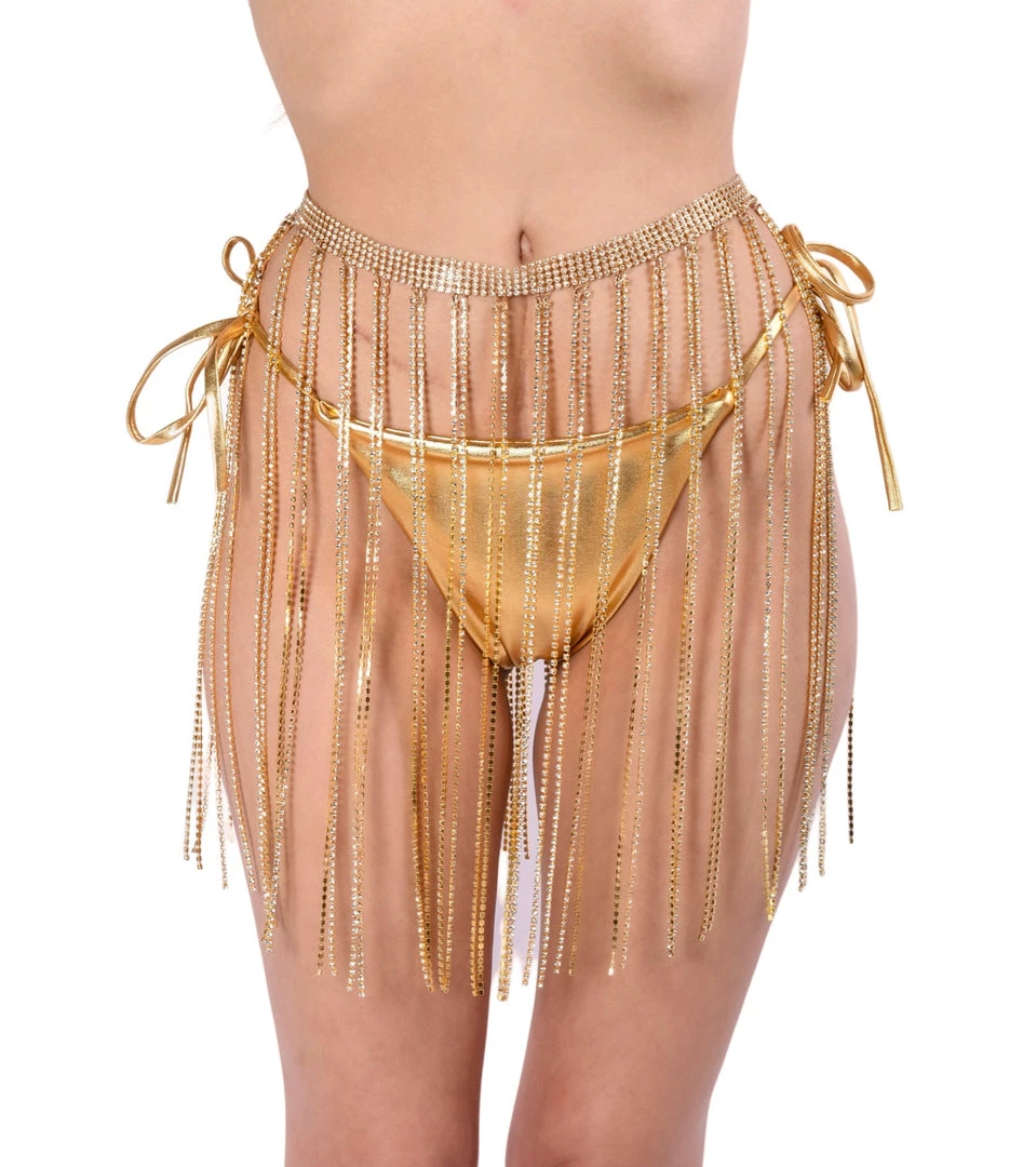 Get this ethereal golden mermaid look with our gold rhinestone tassel skirt and rhinestone mermaid bra completed with an AB rhinestone necklace/ body chain. All made of the highest quality premium materials that sparkle under the light.