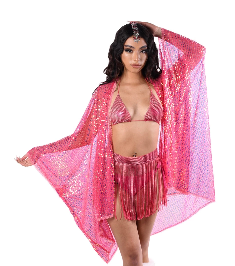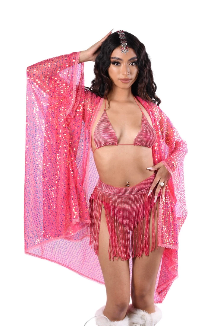 The queen of roses is here and she’s dressed up in full rose pink forever. We’ve paired our pink rhinestone skirt set with a matching iridescent rose pink sparkly kimono that glistens under the light to complete this fabulous look. Made of high quality materials and premium fabrics.