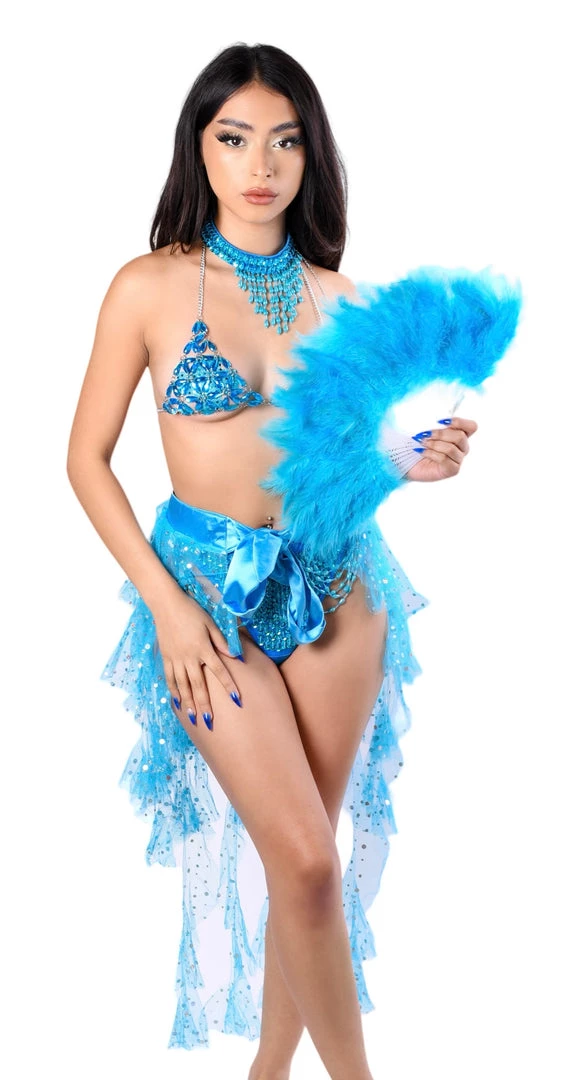 Get this iconic festival look that sold out almost immediately. You deserve to be the center of attention- this look is made for our show stopping babes that love to stand out from the crowd. Consists of a blue gem jewelry top, our pixie blue hand stitched bottoms and aqua blue lace wrap skirt. The matching necklace and fan are also included <3