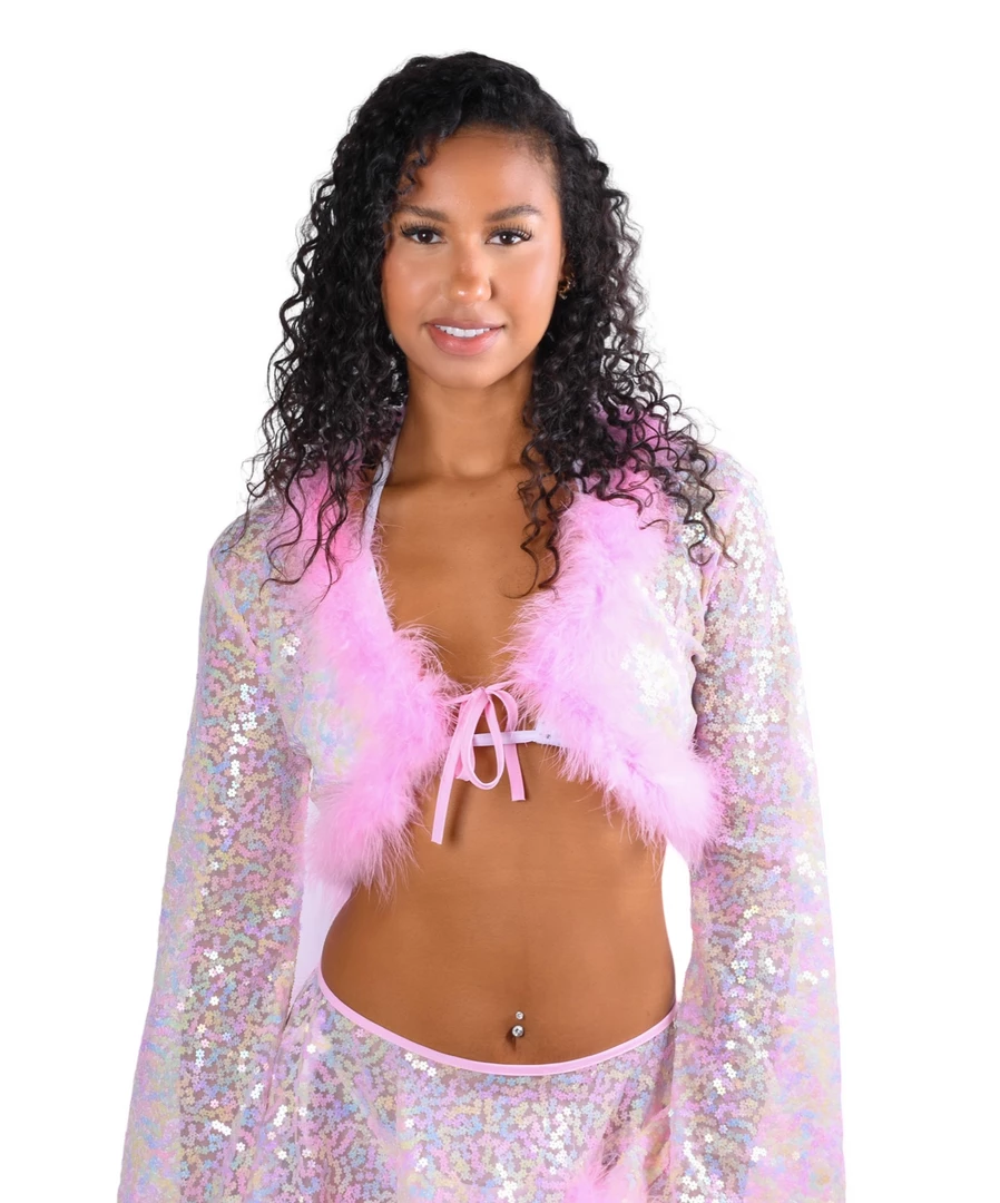 Our favorite style of the season- Stand out in this adorable baby pink candy set. Made of high quality sequin fabric that glistens under the light and fuzzy lining.