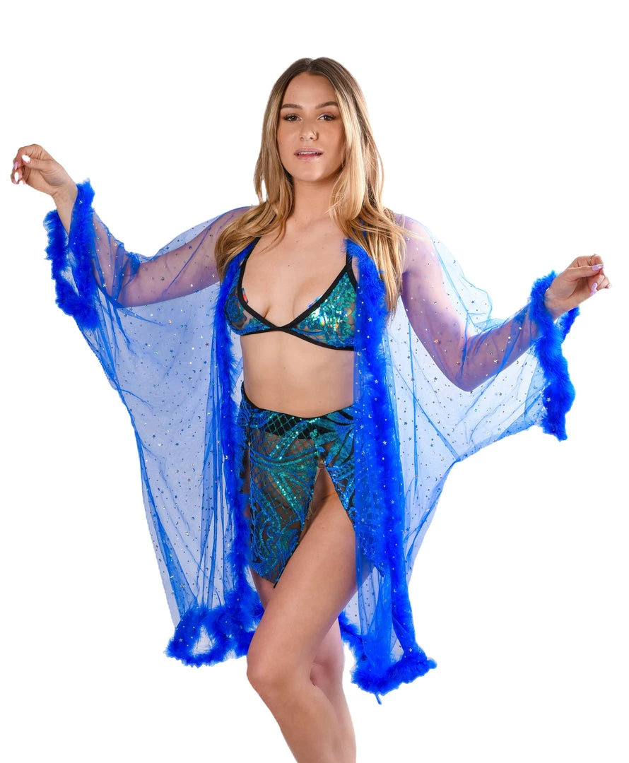 Dance the night away in this royal blue kimono. This babe is exclusively designed in Los Angeles and exclusively produced by us. It is made of high quality fuzz and premium fabric materials.