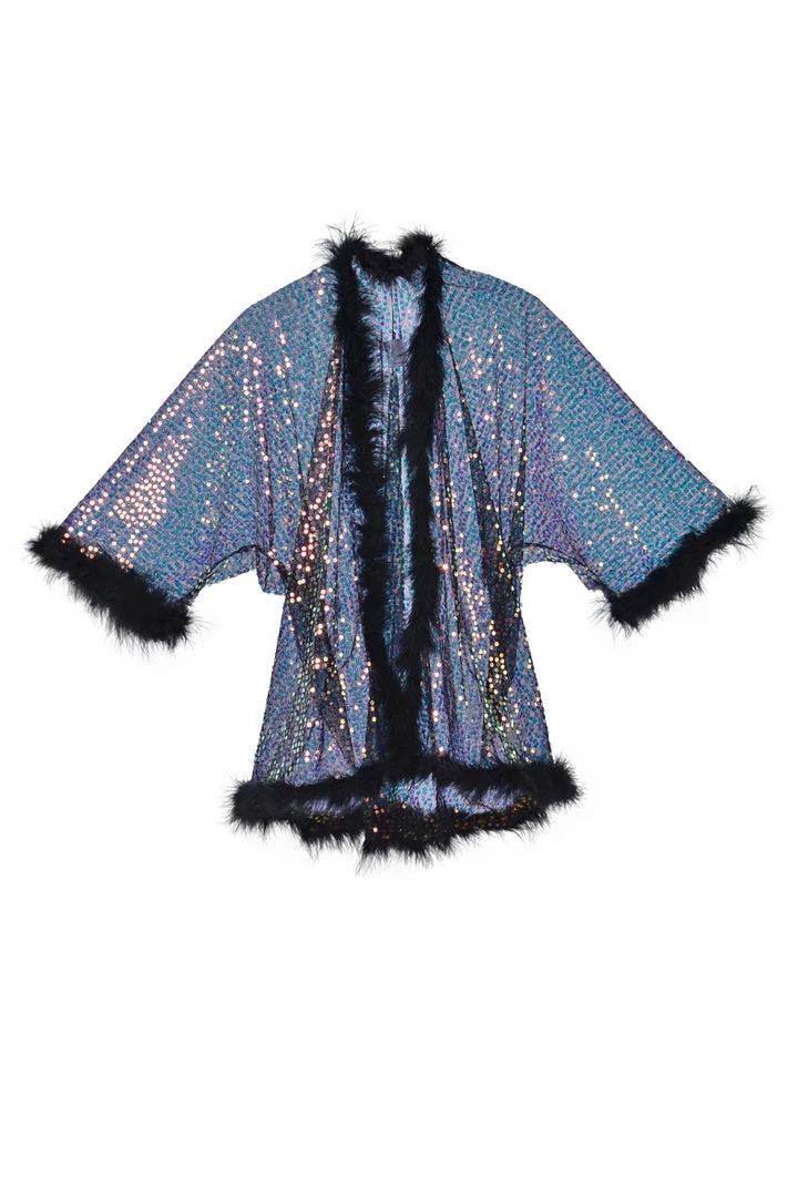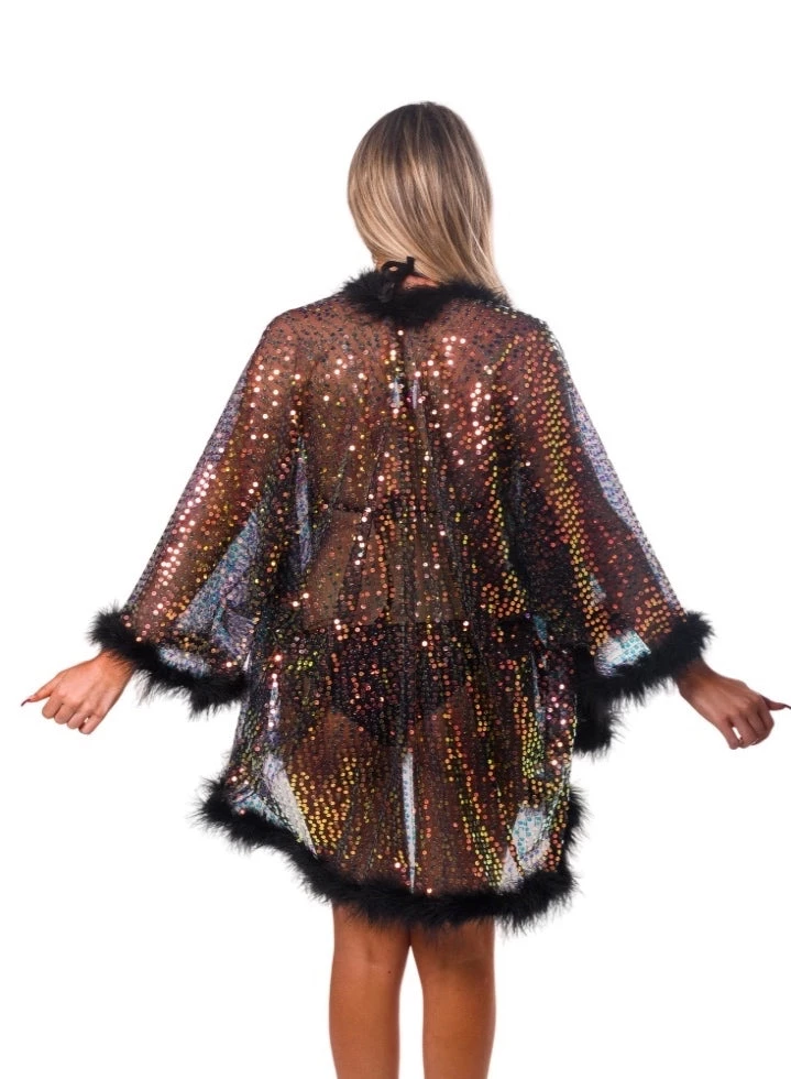 Dance the night away in this black fuzzy kimono made with premium fabric and high quality sequins that reflect and sparkle in light.