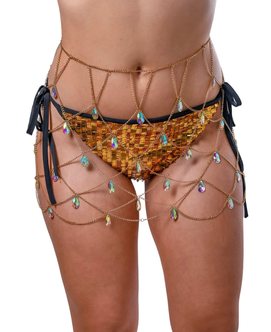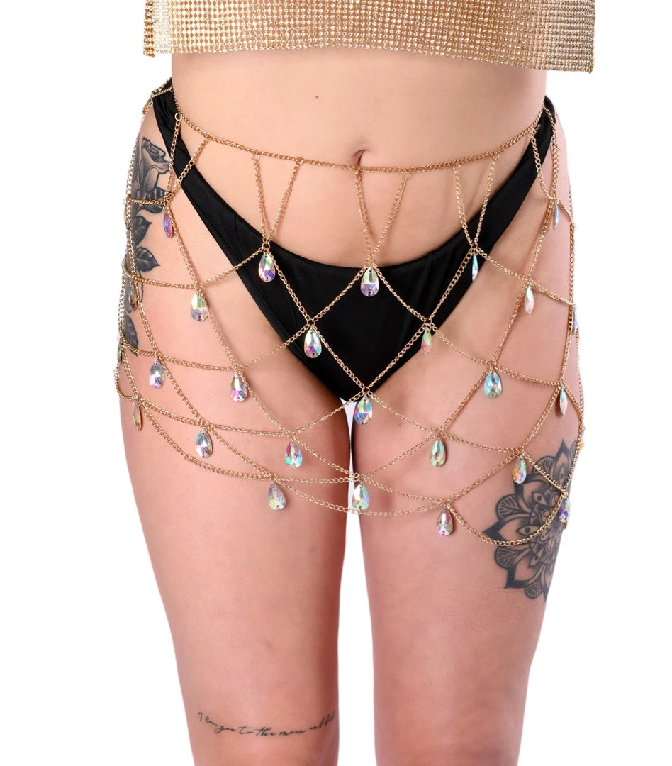 This gold chain skirt has high quality iridescent gems that glisten in the sunlight