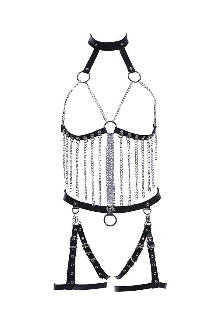 The body harness is made of vegan leather & chains. We make sure that no animals are hurt during the production. Harness is ONE SIZE fits all, comfortably adjust at neck & back. Style with bra/halter tops, or even just the pasties. Go get LIT. Perfect for party wear, costumes, festival clothing, festival fashion, rave wear, & EDM outfits, etc.