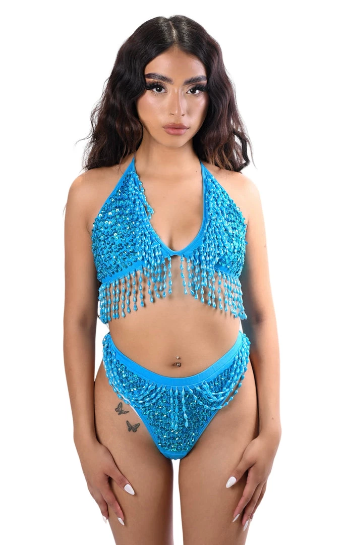 Embrace your inner pixie fairy in this aqua blue sequin set. Mermaids wish they could look this fabulous. Perfect for festivals, or styling up at any colorful event. Our Hand-Stitched sequin collection uses the most premium materials in the industry. Designed exclusively by us here in Socal. Each sequin is hand-stitched one by one to make sure you sparkle throughout the night.