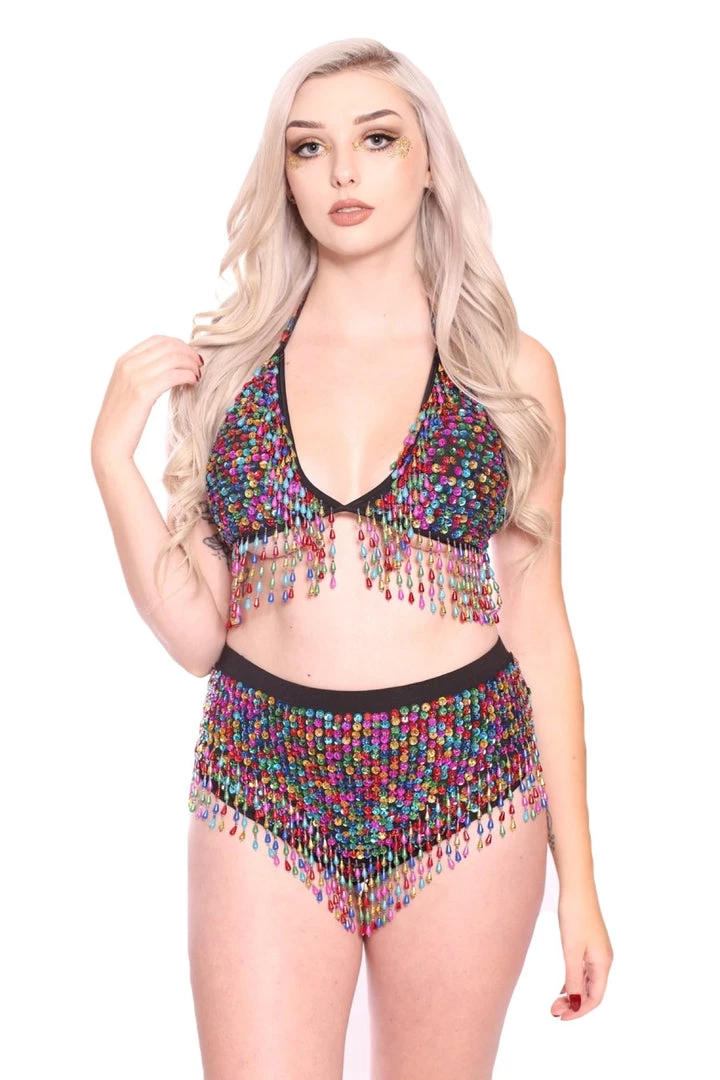 Enter the land of lucky charms in this magical rainbow sequin set. This candy coated look will surely make you the most tasteful babe in the room. Our Hand-Stitched sequin collection uses the most premium materials in the industry. Designed exclusively by us here in Socal. Each sequin is hand-stitched one by one to make sure you shine as bright as you deserve.