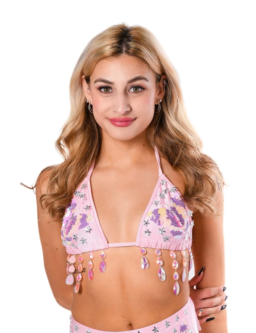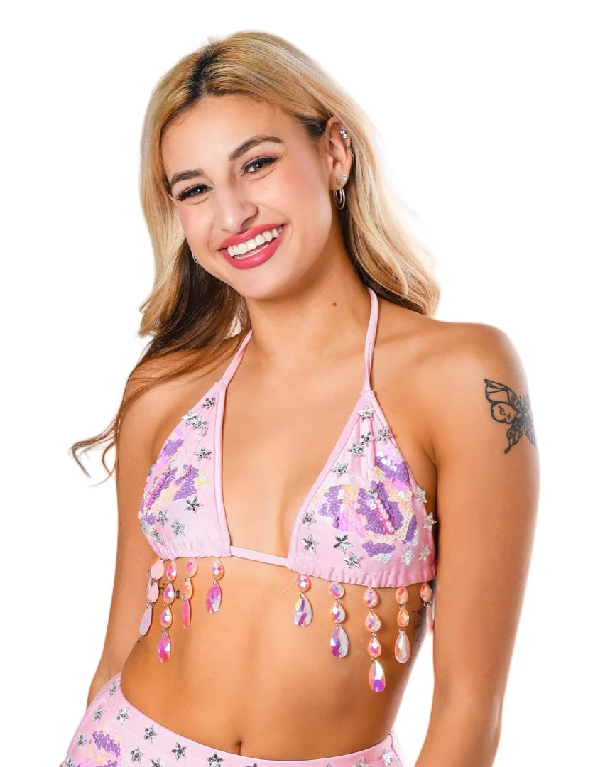 Tie at back. Made of high quality sequins, rhinestones, stretchy velvet fabric