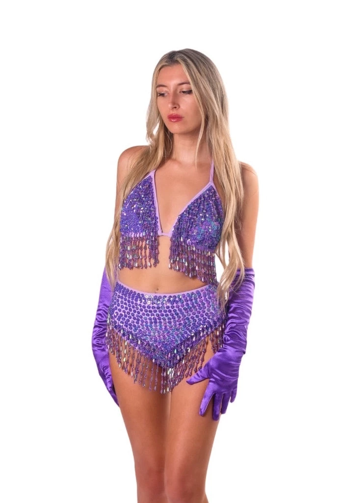 Stand out in this dreamy lilac colored sequin set. Set includes triangle tie top and high waisted bottoms. Perfect for festivals, or styling up at any colorful event. Our Hand-Stitched sequin collection uses the most premium materials in the industry. Designed exclusively by us here in Socal. Each sequin is hand-stitched one by one to make sure you sparkle throughout the night