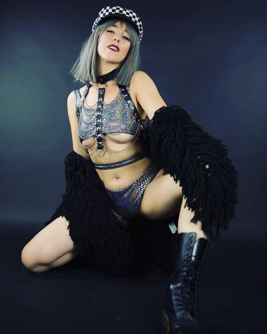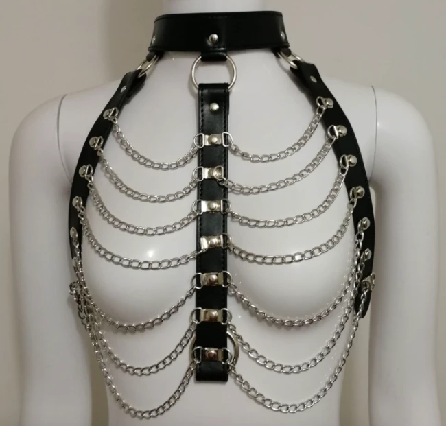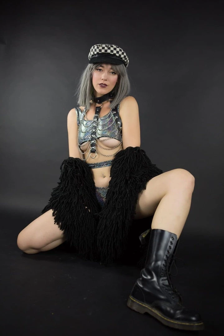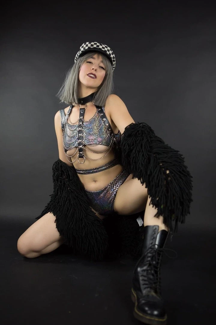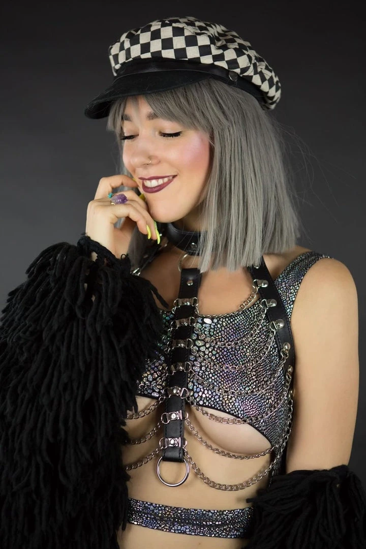 The body harness is made of vegan leather & chains. We make sure that no animals are hurt during the production. Harness is ONE SIZE fits all, comfortably adjust at neck & back. Style with bra/halter tops, or even just the pasties. Go get LIT. Perfect for party wear, costumes, festival clothing, festival fashion, rave wear, & EDM outfits, etc.