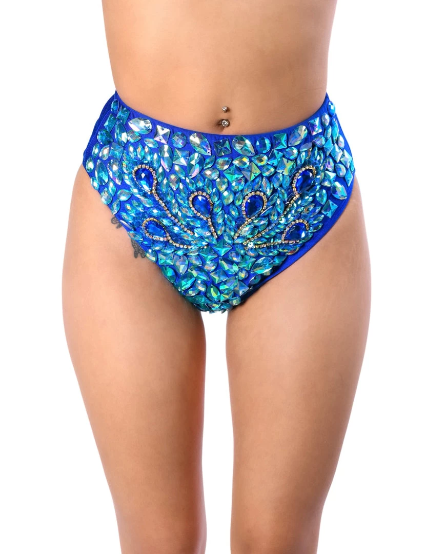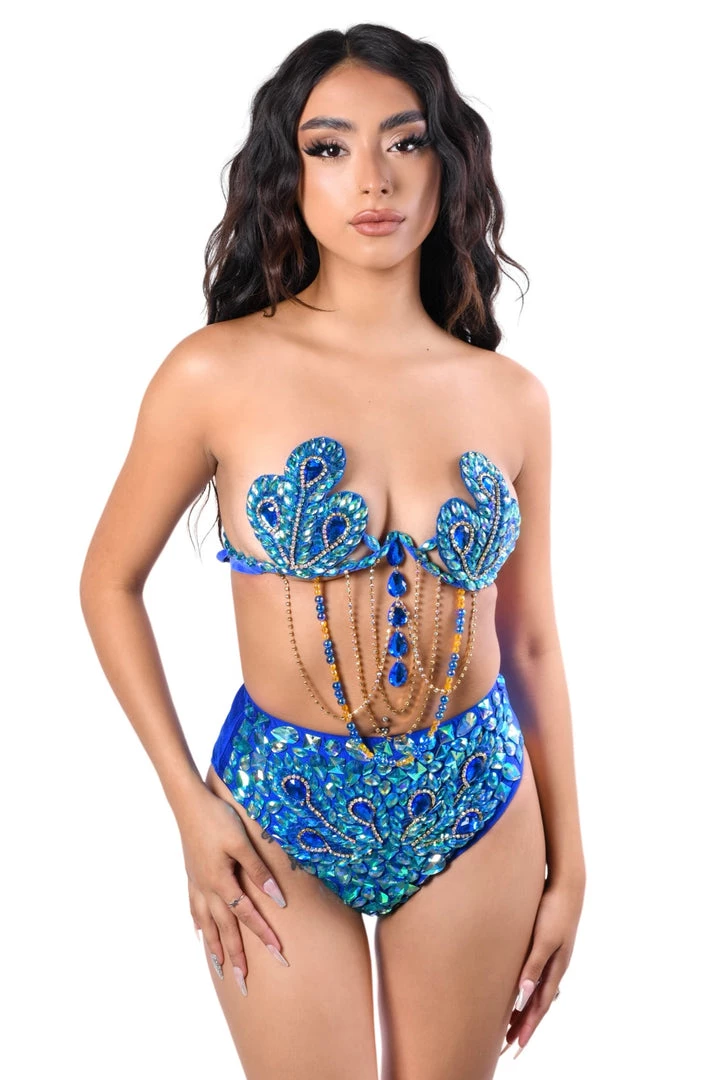 Get the hottest style this season- these unique hand crafted carnival bra tops are embroidered with iridescent rhinestone gem pieces. This bra is super easy to wear, ties in the back and stays put while dancing. Each piece is carefully crafted for this beautifully detailed piece that is sure to make you stand out in the crowd. You deserve to be the center of attention <3 paired with our matching indigo peacock bottoms- you’re ready to go babe!