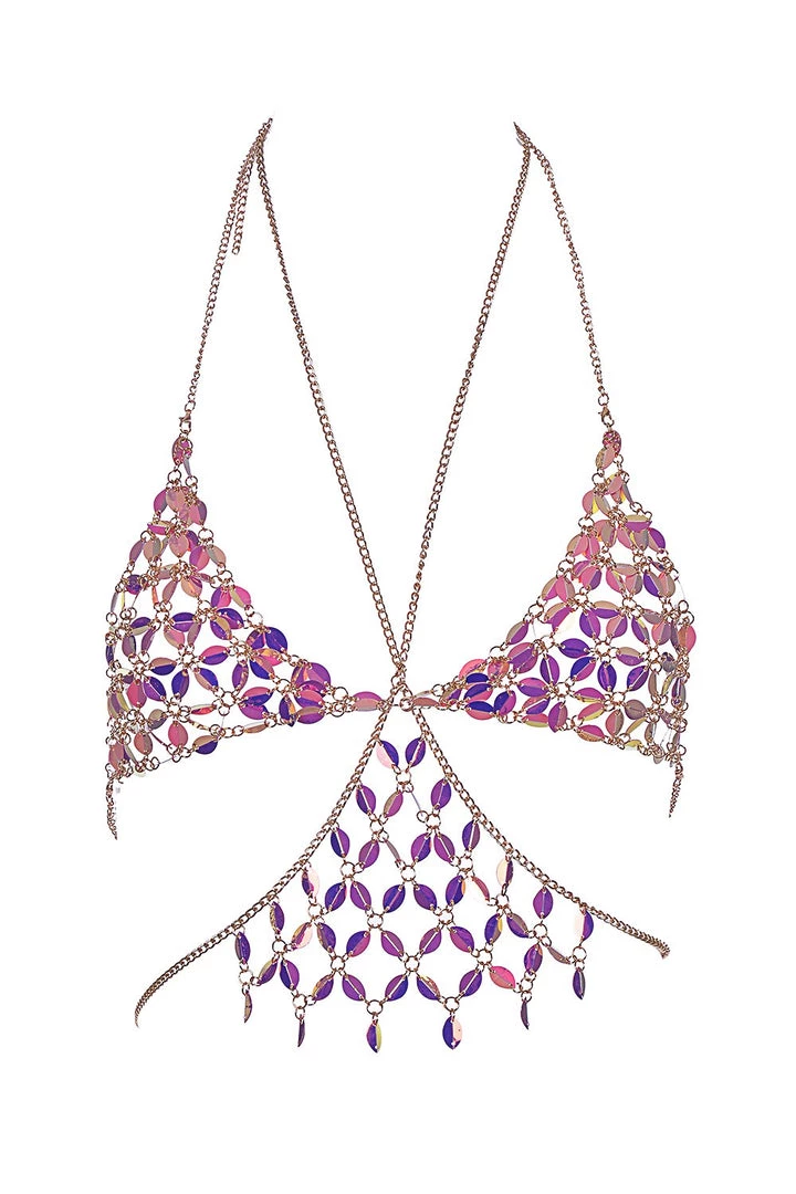 This aura iridescent daisy chain top is made of handmade aura iridescent flower shaped rhinestone pieces & silver chains, pair with a bra top & bottom and our sequin kimono for a complete look and be prepare to get lots of compliments at festivals. Easy to wear.