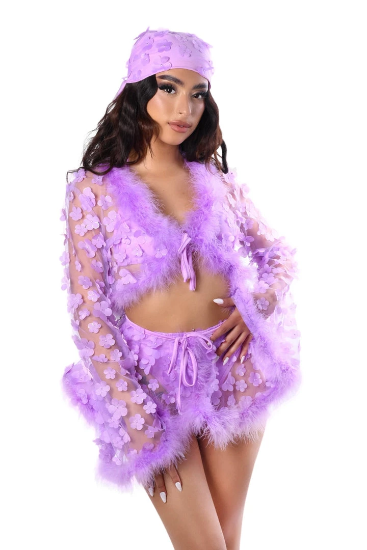 Our favorite style of the season and now available in new colors- Stand out in this adorable lilac set. Made of high quality mesh fabric with flower details and fuzzy lining.