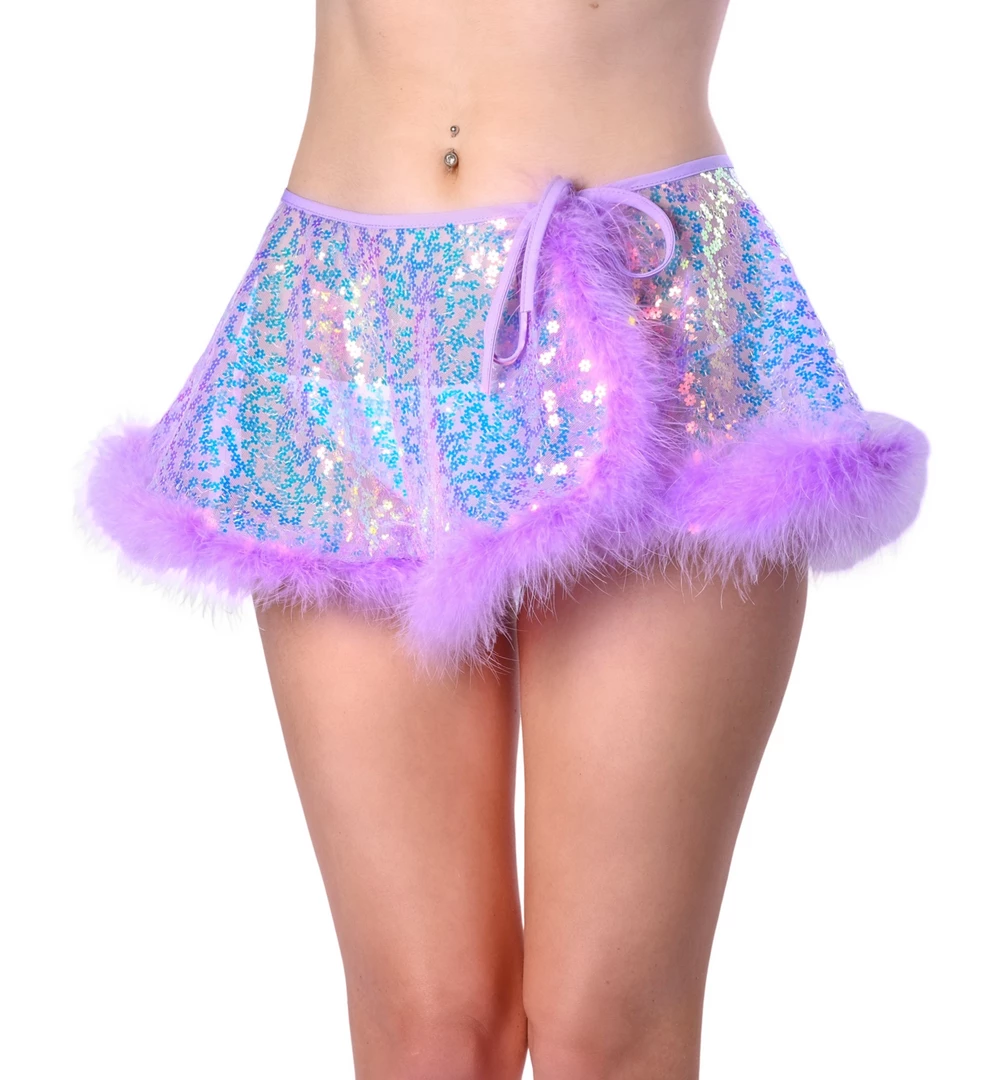 Our favorite style of the season- Stand out in this adorable bright lilac skirt. Made of high quality sequin fabric that glistens under light and fuzzy lining.