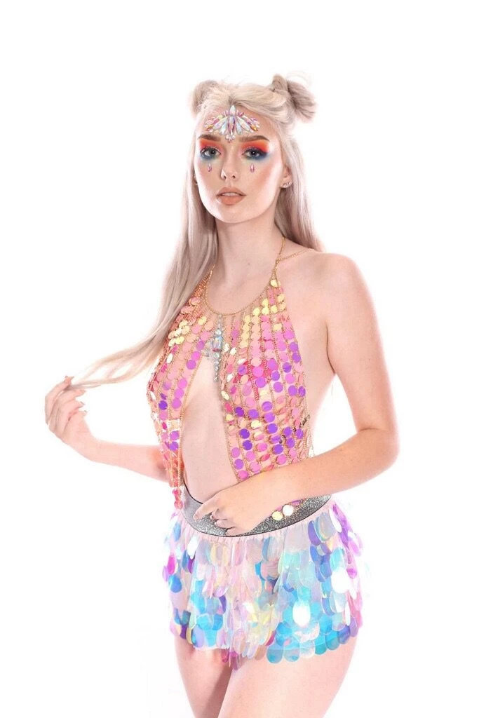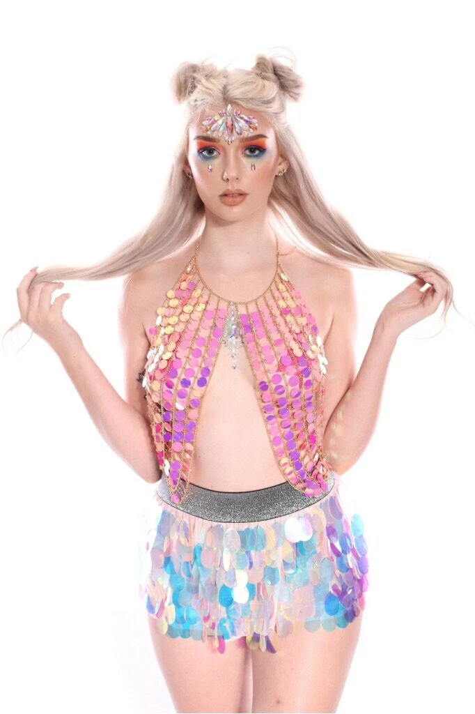 This special iridescent unicorn tears body jewelry halter top is one of our best selling items. It is handmade of small round iridescent sequins that reflects different colors Each piece takes about 2 hours to make. How lucky we are that we get to wear amazing art pieces like this? It is tie at neck & back, super easy & comfortably to wear. Extremely enjoyable to wear during summer time as the chain is oddly satisfying to wear on your body. How cool is that! Get one before they sold out again!