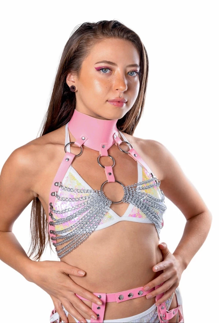 Embrace your inner badass in this bright pink harness. Perfect on its own with pasties or as an accessory over any outfit