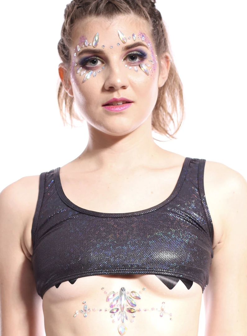 Our Obsidian Galaxy Rave Wear Collection is made of black holographic spandex fabric. It comes with three sizes, Small, Medium & Large. Basic must-have. Very comfortable to wear. Available in 5 other colors.Â