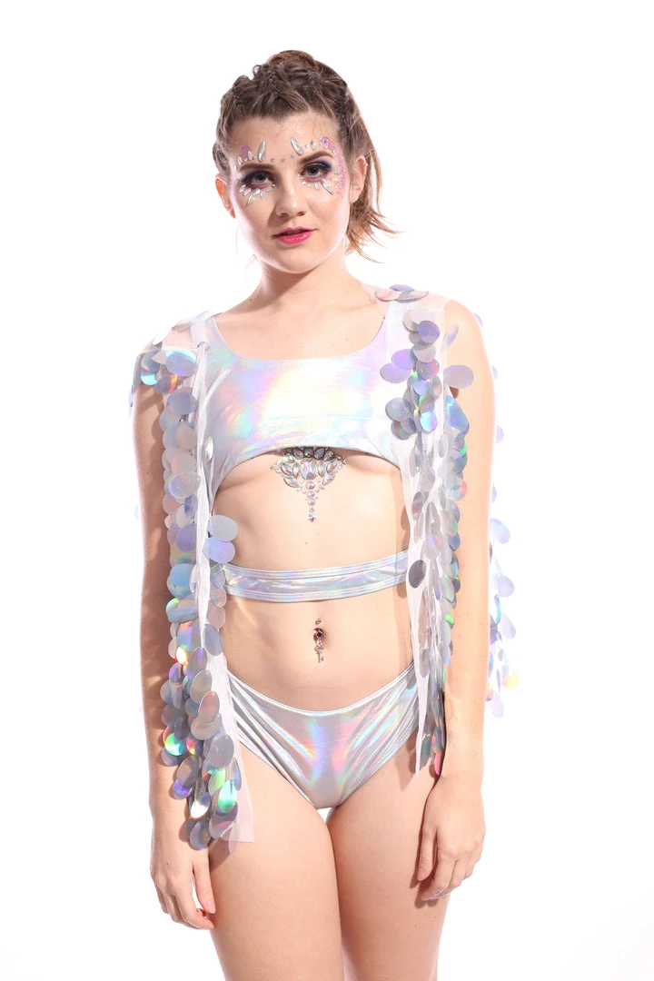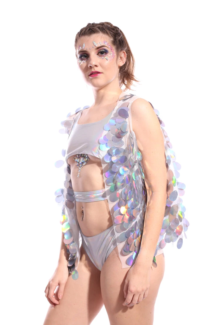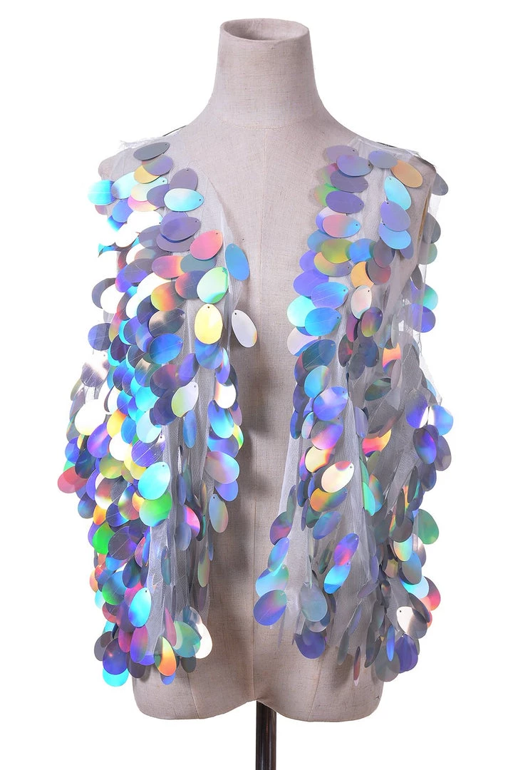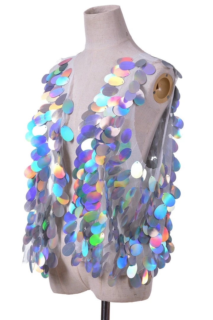 This sequin vest is made of egg shell rainbow holographic sequins, carefully lined with matching color thread. It is unisex, ONE SIZE fit XS – XL, easy to style. Perfect for festival clothing, festival fashion, rave wear, & EDM outfits.