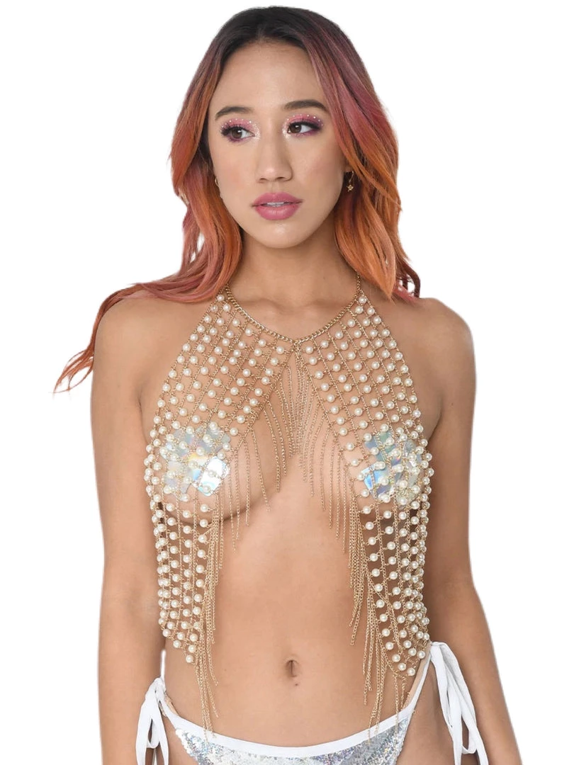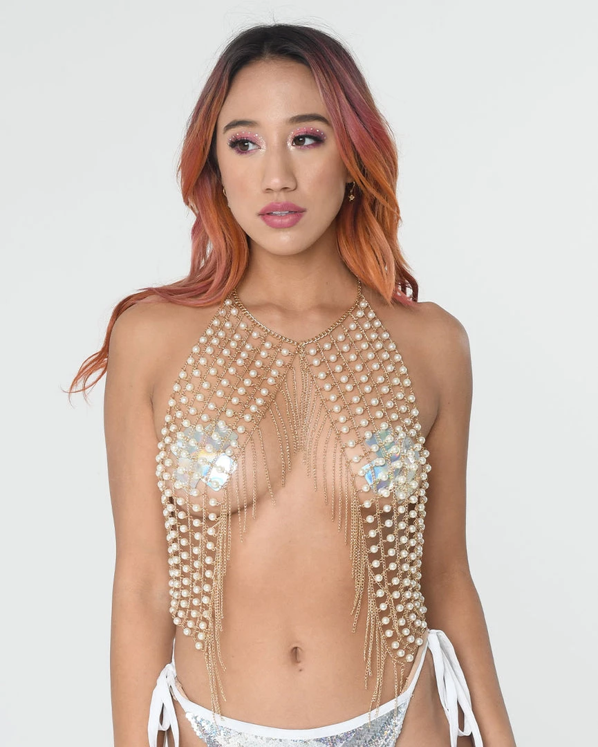 This sparkle pearl tassel chain halter top will make you stand out from the crowd. This is the most edgy trend you could get for the season. All handmade by our talented artists. Be prepare to get lots of compliments 🙂