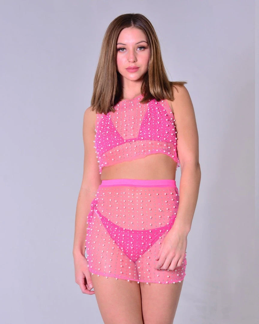 This pink set contains a super cute fuzzy bra top and skirt that’s fuzzy on the edges, it is very soft and comfy to wear.