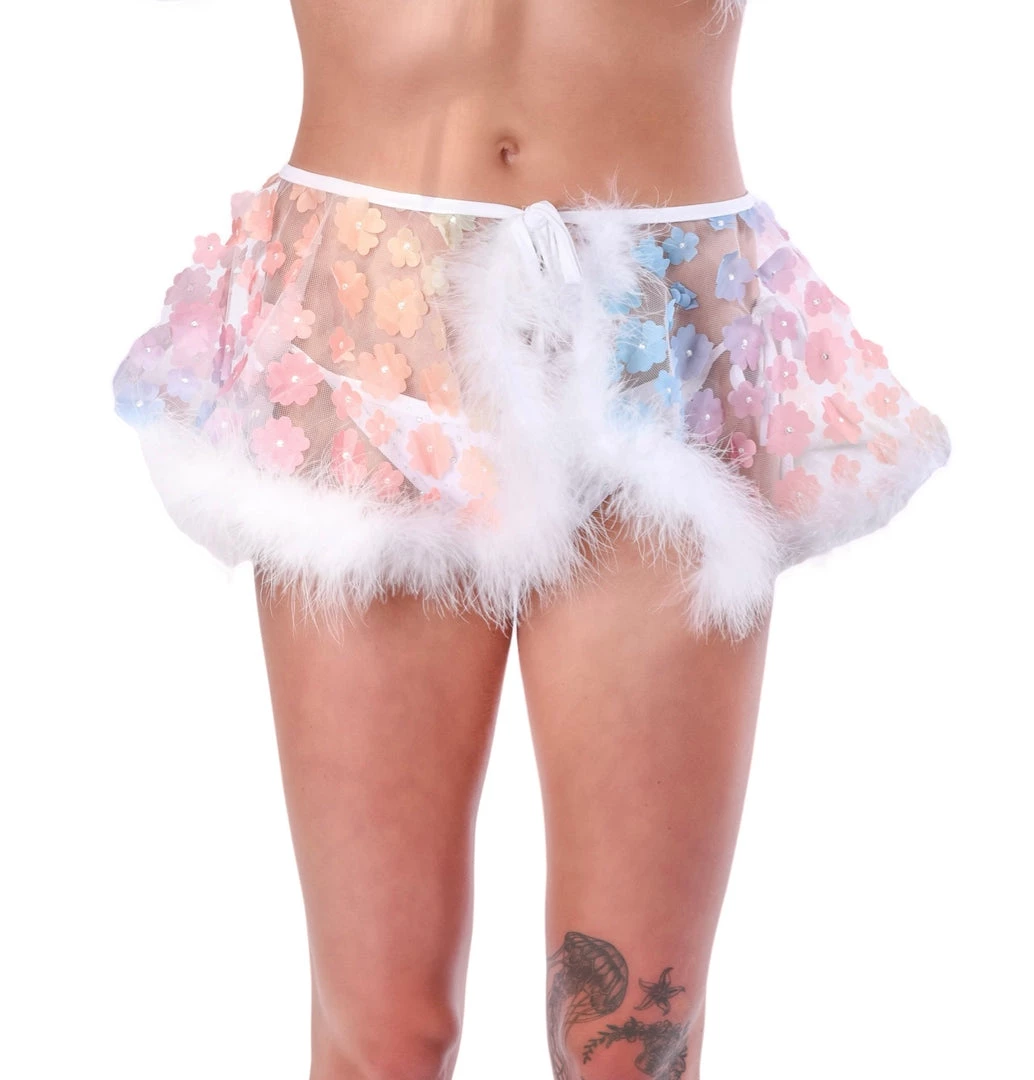 Our favorite style of the season and now available in new colors- Stand out in this pastel rainbow set. Made of high quality mesh fabric with flower details and fuzzy lining.
