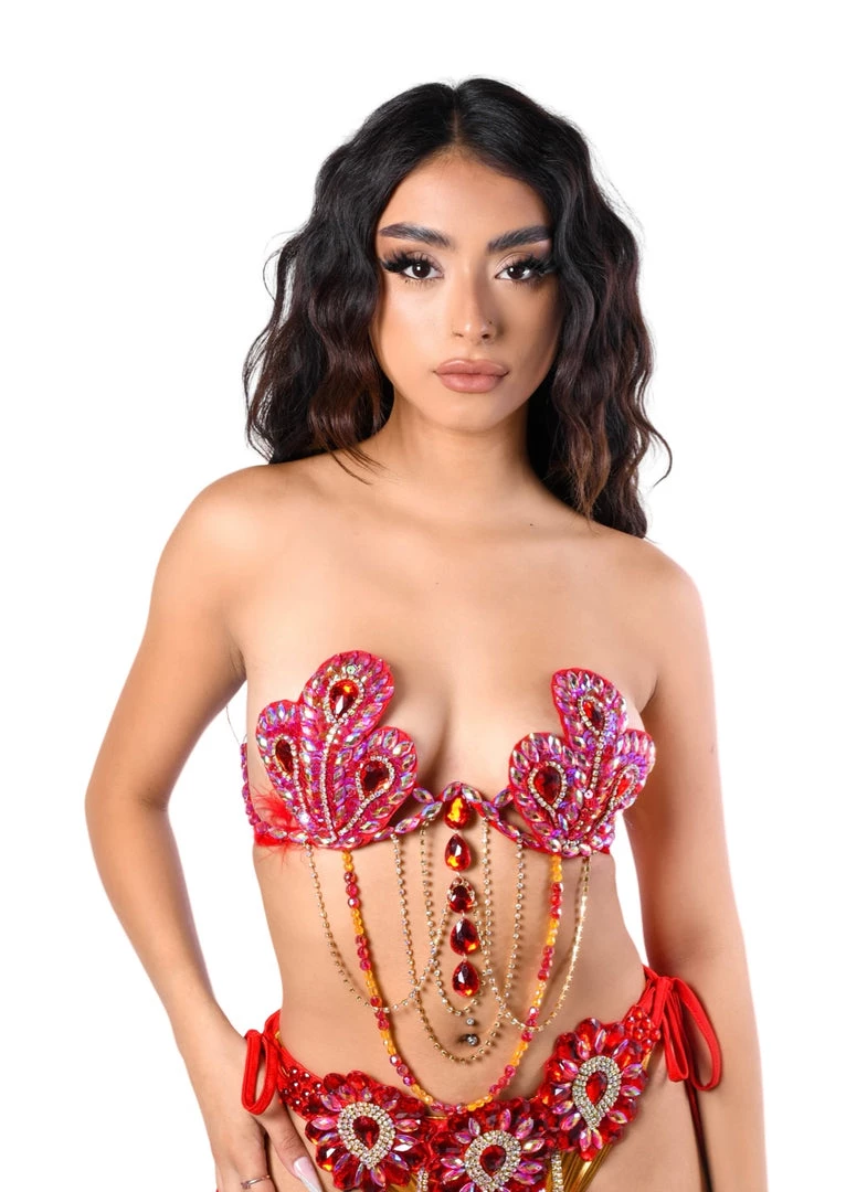 Get the hottest style this season- these unique hand crafted carnival bra tops are embroidered with rhinestone gem pieces. This bra is super easy to wear, ties in the back and stays put while dancing. Each piece is carefully crafted for this beautifully detailed piece that is sure to make you stand out in the crowd. You deserve to be the center of attention <3 pair with our red magnolia belt and a kimono and you’re ready to go babe!