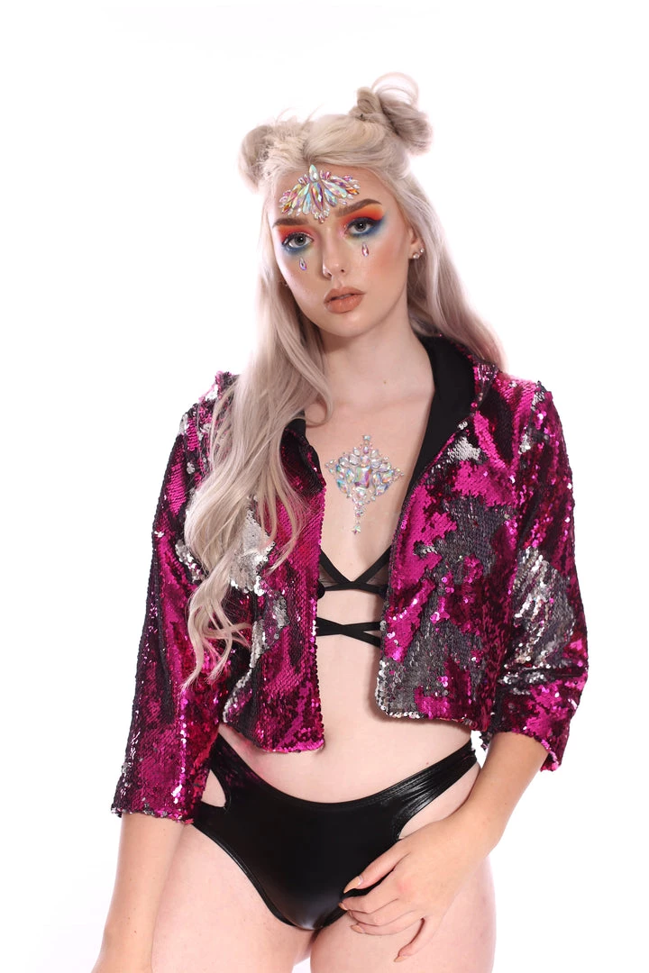 This reversible cropped sequin jacket is made of pink/silver sequins. It is SO cute! Wear if for everyday as well as at festivals. Be ready to get tons of compliments! 😀 It is one size fits XS – XL. The jacket has a soft inner layer that makes the whole experience so different, it is SUPER comfortable!