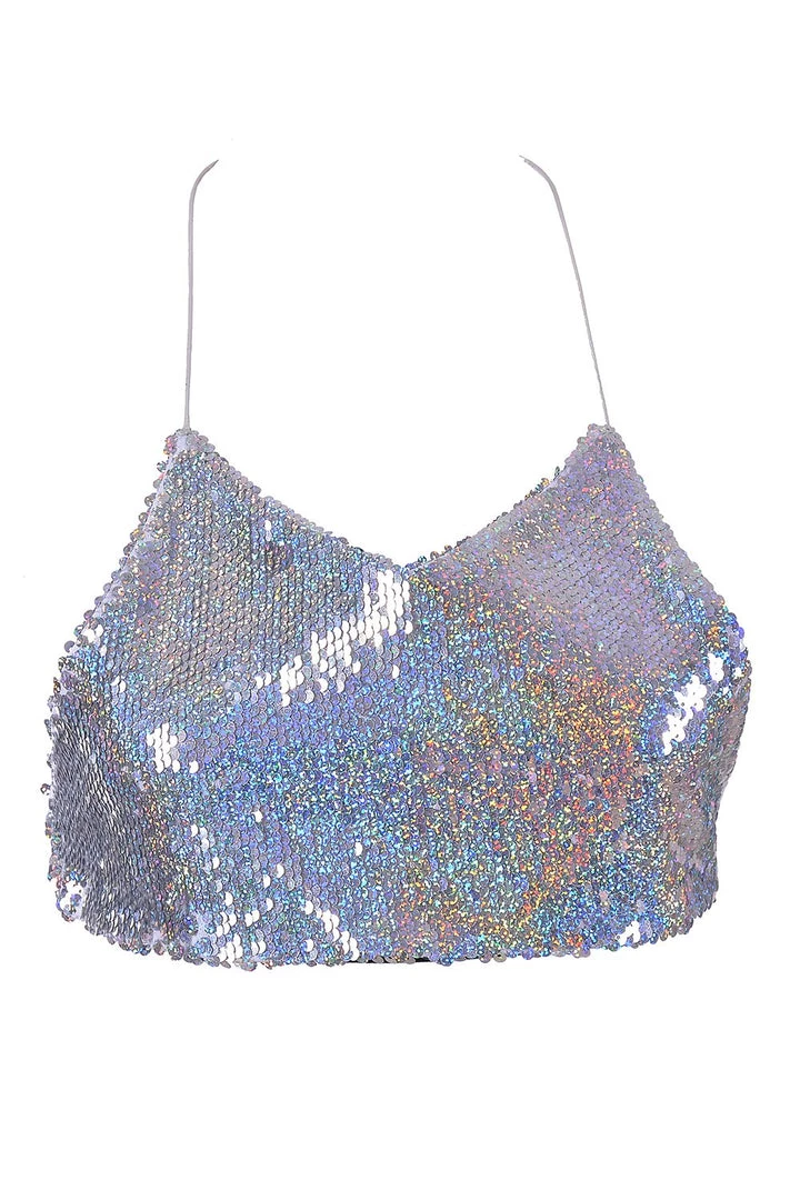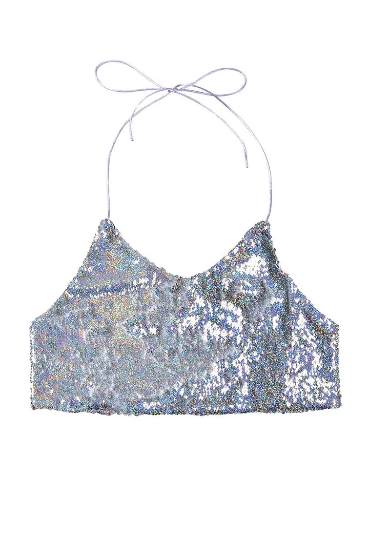 This unique reversible sequin halter top is made of reversible silver holographic sequins. It is the most popular color! The top is one size, tie at neck & back. Super comfortable to wear.