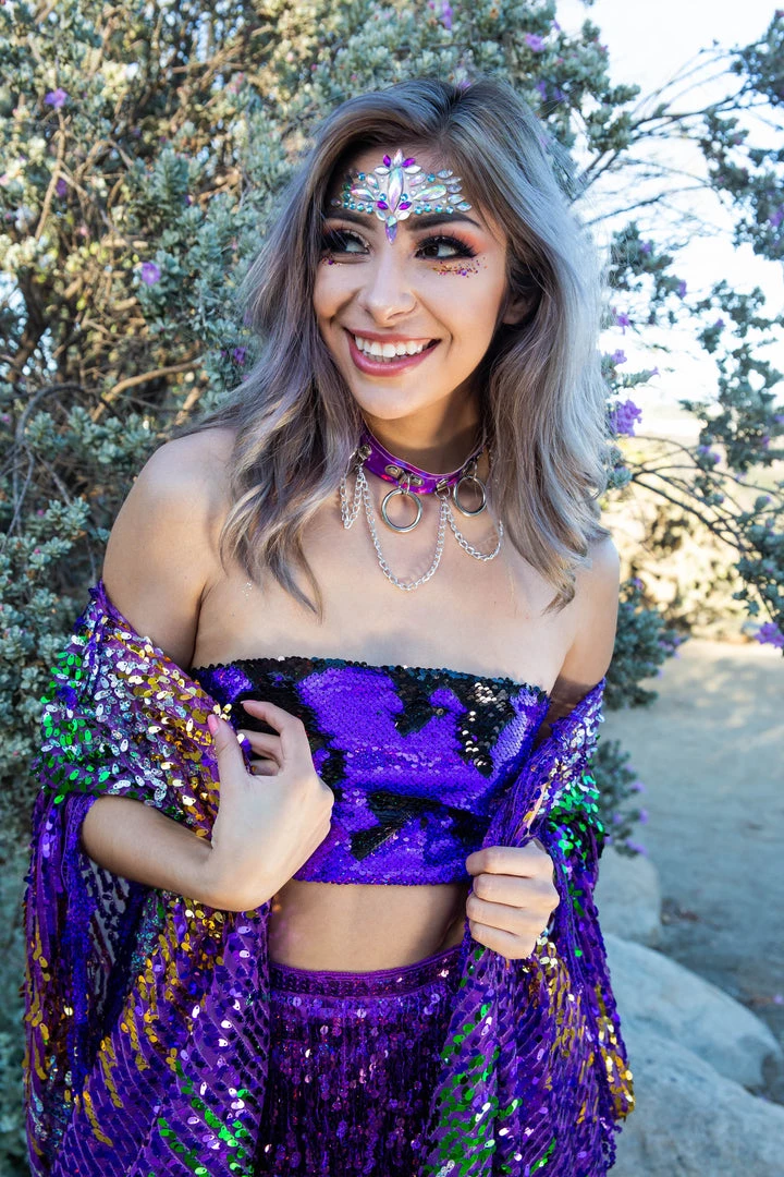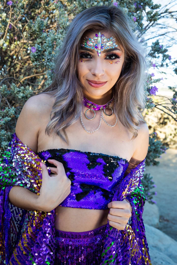 This reversible sequin bikini top is made of high quality purple/black holographic sequin fabrics. It is our own label made in house. This item is one size fits XS – L, it has a comfortable inner layer, adjustable at neck & back.